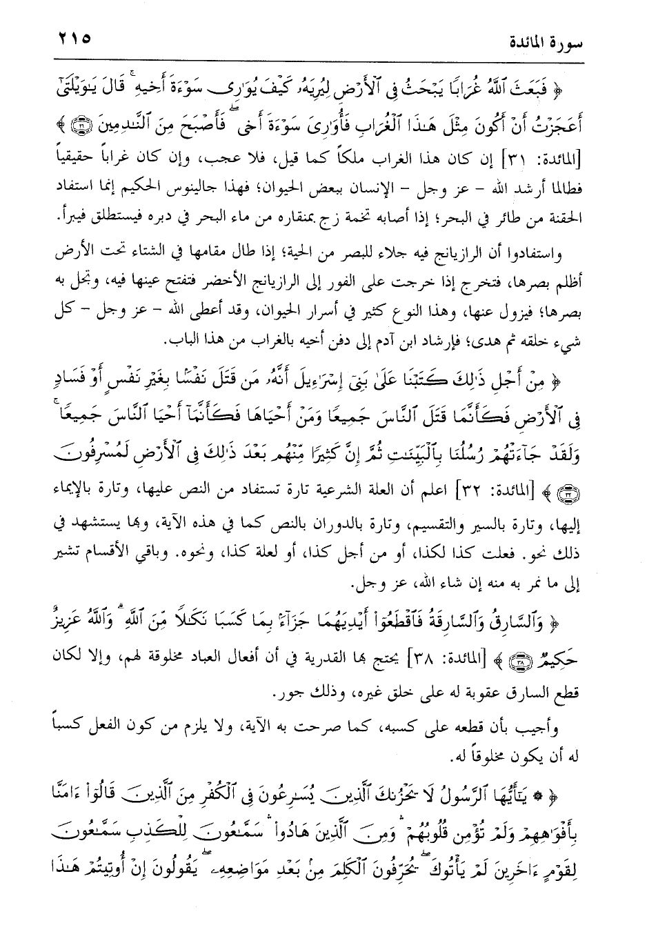 {وَالسّارِقُ وَالسّارِقَةُ فَاقْطَعُوا أَيْدِيَهُما جَزاءً بِما كَسَبا نَكالاً مِنَ اللهِ وَاللهُ عَزِيزٌ حَكِيمٌ} (38) [المائدة: 38] يحتج بها القدرية في أن أفعال العباد مخلوقة لهم، وإلا لكان قطع السارق عقوبة له على خلق غيره، وذلك جور.