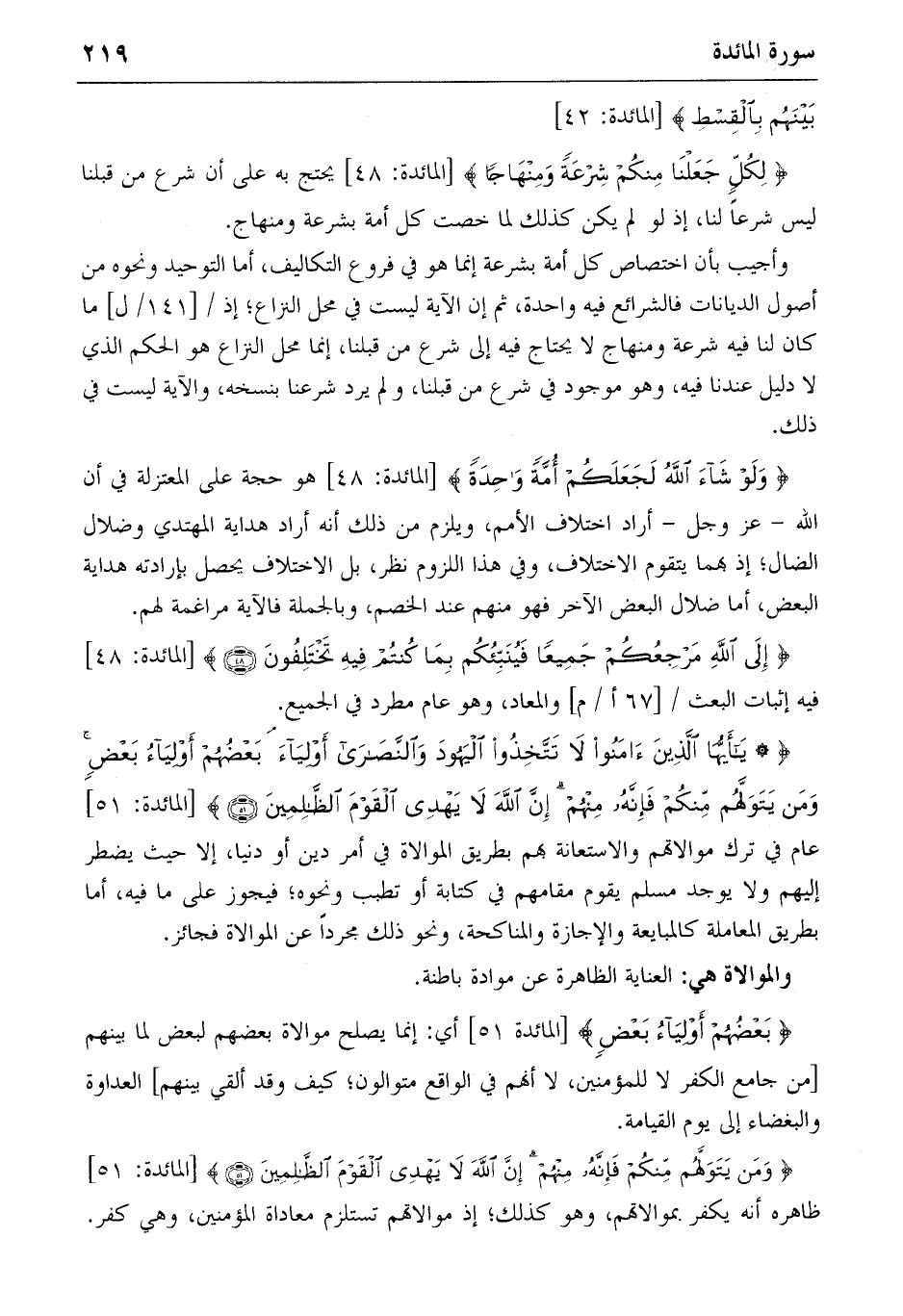 {وَلَوْ شاءَ اللهُ لَجَعَلَكُمْ أُمَّةً واحِدَةً} [المائدة: 48] هو حجة على المعتزلة في أن الله-عز وجل-أراد اختلاف الأمم، ويلزم من ذلك أنه أراد هداية المهتدي وضلال الضال؛ إذ بهما يتقوم الاختلاف، وفي هذا اللزوم نظر، بل الاختلاف يحصل بإرادته هداية البعض، أما ضلال البعض الآخر فهو منهم عند الخصم، وبالجملة فالآية مراغمة لهم.