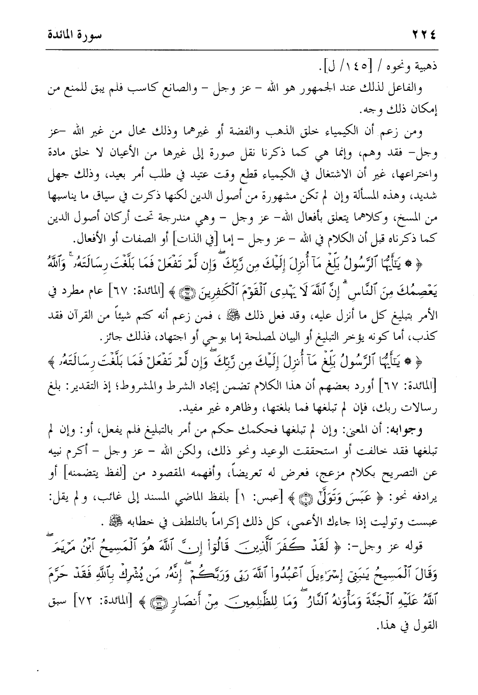 {* يا أَيُّهَا الرَّسُولُ بَلِّغْ ما أُنْزِلَ إِلَيْكَ مِنْ رَبِّكَ وَإِنْ لَمْ تَفْعَلْ فَما بَلَّغْتَ رِسالَتَهُ وَاللهُ يَعْصِمُكَ مِنَ النّاسِ إِنَّ اللهَ لا يَهْدِي الْقَوْمَ الْكافِرِينَ} (67) [المائدة: 67] عام مطرد في الأمر بتبليغ كل ما أنزل عليه، وقد فعل ذلك صلّى الله عليه وسلّم، فمن زعم أنه كتم شيئا من القرآن فقد كذب، أما كونه يؤخر التبليغ أو البيان لمصلحة إما يوحي أو اجتهاد، فذلك جائز.