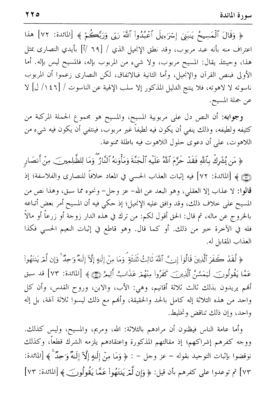 {مَنْ يُشْرِكْ بِاللهِ فَقَدْ حَرَّمَ اللهُ عَلَيْهِ الْجَنَّةَ وَمَأْواهُ النّارُ وَما لِلظّالِمِينَ مِنْ أَنْصارٍ} (72) [المائدة: 72] فيه إثبات العذاب الحسي في المعاد خلافا للنصارى والفلاسفة؛ إذ قالوا: لا عذاب إلا العقلي، وهو البعد عن الله-عز وجل-ونحوه مما سبق، وهذا نص من المسيح على خلاف ذلك، وقد وافق عليه الإنجيل؛ إذ حكي فيه أن المسيح أمر بعض أتباعه بالخروج عن ماله، ثم قال: الحق أقول لكم: من ترك في هذه الدار زوجة أو زرعا أو مالا فله في الآخرة خير من ذلك. أو كما قال. وهو قاطع في إثبات النعيم الحسي فكذا العذاب المقابل له.