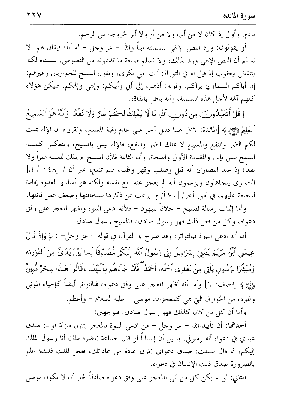 {قُلْ أَتَعْبُدُونَ مِنْ دُونِ اللهِ ما لا يَمْلِكُ لَكُمْ ضَرًّا وَلا نَفْعاً وَاللهُ هُوَ السَّمِيعُ الْعَلِيمُ} (76) [المائدة: 76] هذا دليل آخر على عدم إلهية المسيح، وتقريره أن الإله يملك لكم الضر والنفع والمسيح لا يملك الضر والنفع، فالإله ليس بالمسيح، وينعكس كنفسه المسيح ليس بإله. والمقدمة الأولى واضحة، وأما الثانية فلأن المسيح لم يملك لنفسه ضرا ولا نفعا؛ إذ عند النصارى أنه قتل وصلب وقهر وظلم، فلم يمتنع، غير أن/ [148/ل] النصارى يتجاهلون ويزعمون أنه لم يعجز عنه نفع نفسه ولكنه هو أسلمها لعدوه إقامة للحجة عليهم، في أمور أخر/ [70 أ/م] يرغب عن ذكرها لسخافتها وضعف عقل قائلها.