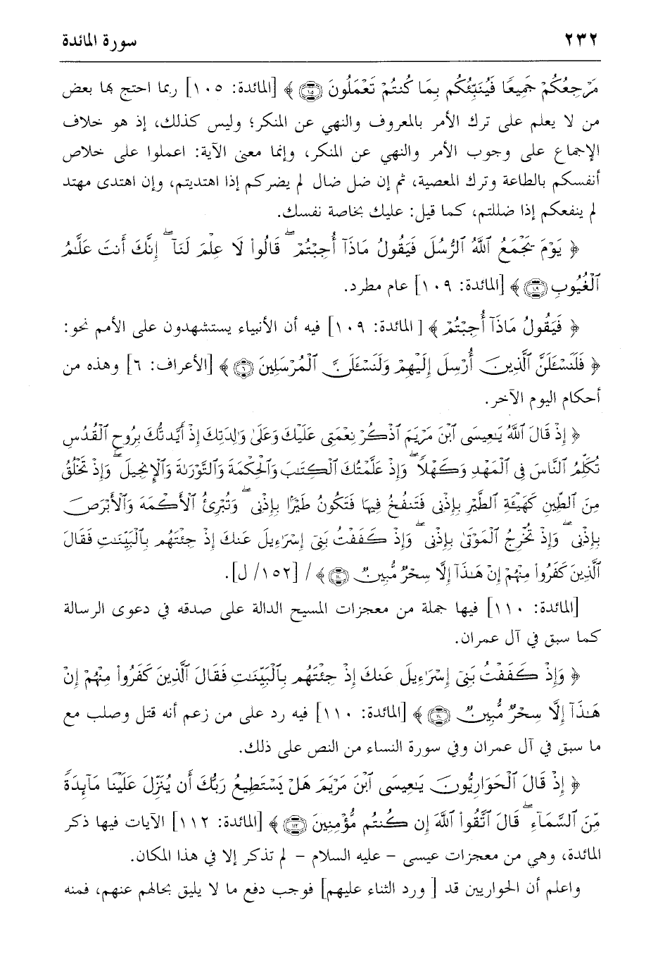 {إِذْ قالَ اللهُ يا عِيسَى اِبْنَ مَرْيَمَ اُذْكُرْ نِعْمَتِي عَلَيْكَ وَعَلى والِدَتِكَ إِذْ أَيَّدْتُكَ بِرُوحِ الْقُدُسِ تُكَلِّمُ النّاسَ فِي الْمَهْدِ وَكَهْلاً وَإِذْ عَلَّمْتُكَ الْكِتابَ وَالْحِكْمَةَ وَالتَّوْراةَ وَالْإِنْجِيلَ وَإِذْ تَخْلُقُ مِنَ الطِّينِ كَهَيْئَةِ الطَّيْرِ بِإِذْنِي فَتَنْفُخُ فِيها فَتَكُونُ طَيْراً بِإِذْنِي وَتُبْرِئُ الْأَكْمَهَ وَالْأَبْرَصَ بِإِذْنِي وَإِذْ تُخْرِجُ الْمَوْتى بِإِذْنِي وَإِذْ كَفَفْتُ بَنِي إِسْرائِيلَ عَنْكَ إِذْ جِئْتَهُمْ بِالْبَيِّناتِ فَقالَ الَّذِينَ كَفَرُوا مِنْهُمْ إِنْ هذا إِلاّ سِحْرٌ مُبِينٌ} (110) / [152/ل].
