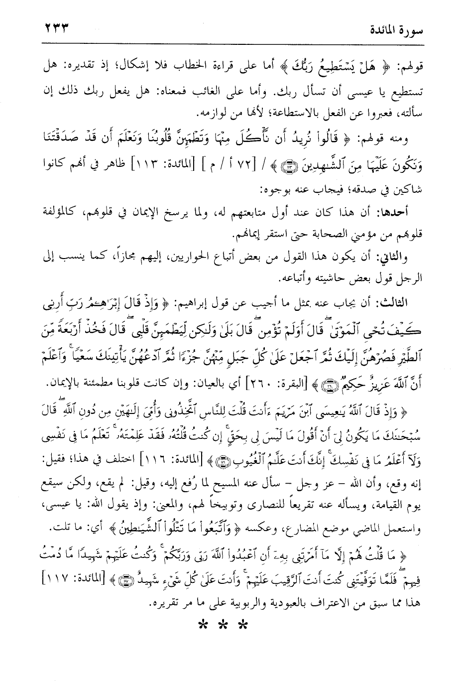 {ما قُلْتُ لَهُمْ إِلاّ ما أَمَرْتَنِي بِهِ أَنِ اُعْبُدُوا اللهَ رَبِّي وَرَبَّكُمْ وَكُنْتُ عَلَيْهِمْ شَهِيداً ما دُمْتُ فِيهِمْ فَلَمّا تَوَفَّيْتَنِي كُنْتَ أَنْتَ الرَّقِيبَ عَلَيْهِمْ وَأَنْتَ عَلى كُلِّ شَيْءٍ شَهِيدٌ} (117) [المائدة: 117] هذا مما سبق من الاعتراف بالعبودية والربوبية على ما مر تقريره.