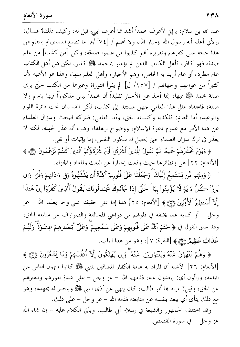 «لأني أعلم أنه رسول الله بإخبار الله، ولا أعلم/ [74 أ/م] ما تصنع النساء» ثم ينتظم من هذا حجة على كفرهم وتقريره أنهم كذبوا من علموا صدقه، وكل [من كذب] من علم صدقه فهو كافر، فأهل الكتاب الذين لم يؤمنوا بمحمد صلّى الله عليه وسلّم كفار، لكن هل أهل الكتاب عام مطرد، أو عام أريد به الخاص، وهم الأحبار، وأهل العلم منها، وهذا هو الأشبه لأن كثيرا من عوامهم وجهالهم/ [157/ل] لم يقرأ التوراة وغيرها من الكتب حتى يرى صفة محمد صلّى الله عليه وسلّم فيها، إنما أخذ عن الأحبار تقليدا أن محمدا ليس مذكورا فيها باسم ولا صفة، فاعتقاد مثل هذا العامي جهل مستند إلى كذب، لكن القسمان تحت دائرة اللوم والوعيد، أما العالم: فلكذبه وكتمانه الحق، وأما العامي: فلتركه البحث وسؤال العلماء عن هذا الأمر مع عموم دعوة الإسلام، ووضوح برهانها، وهب أنه عذر لجهله، لكنه لا يعذر في ترك سؤال العلماء حتى يحصل له سكون النفس، إما بإثبات أو نفي.