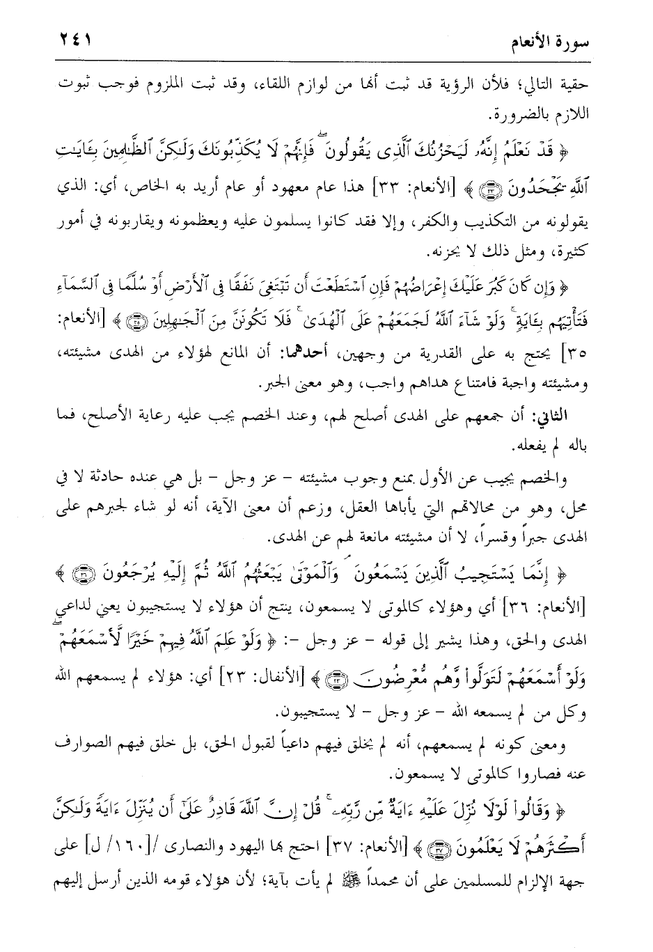 {إِنَّما يَسْتَجِيبُ الَّذِينَ يَسْمَعُونَ وَالْمَوْتى يَبْعَثُهُمُ اللهُ ثُمَّ إِلَيْهِ يُرْجَعُونَ} (36) [الأنعام: 36] أي وهؤلاء كالموتى لا يسمعون، ينتج أن هؤلاء لا يستجيبون يعني لداعي الهدى والحق، وهذا يشير إلى قوله-عز وجل-: {وَلَوْ عَلِمَ اللهُ فِيهِمْ خَيْراً لَأَسْمَعَهُمْ وَلَوْ أَسْمَعَهُمْ لَتَوَلَّوْا وَهُمْ مُعْرِضُونَ} (23) [الأنفال: 23] أي: هؤلاء لم يسمعهم الله وكل من لم يسمعه الله-عز وجل-لا يستجيبون.