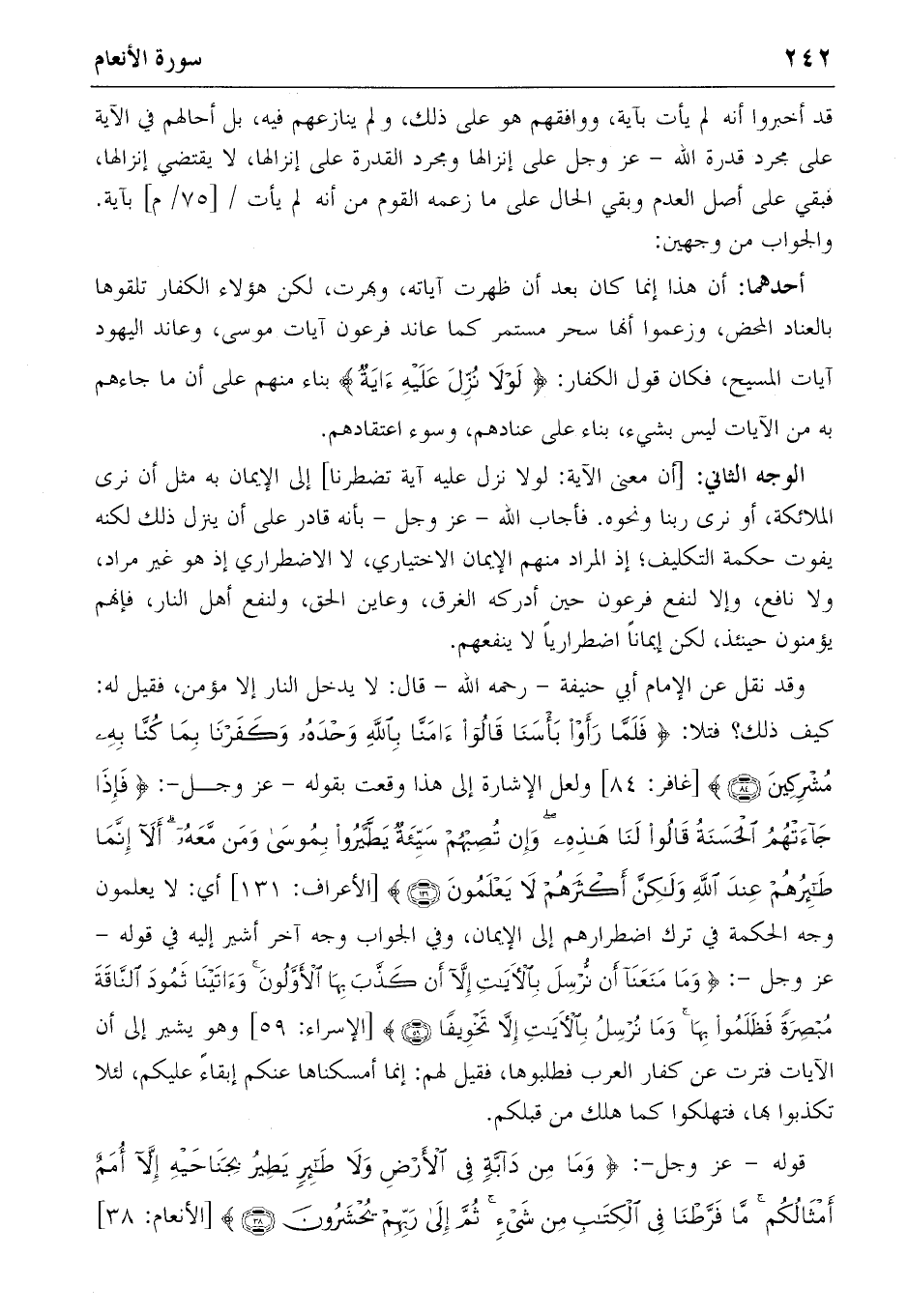 كيف ذلك؟ فتلا: {فَلَمّا رَأَوْا بَأْسَنا قالُوا آمَنّا بِاللهِ وَحْدَهُ وَكَفَرْنا بِما كُنّا بِهِ مُشْرِكِينَ} (84) [غافر: 84] ولعل الإشارة إلى هذا وقعت بقوله-عز وجل-: {فَإِذا جاءَتْهُمُ الْحَسَنَةُ قالُوا لَنا هذِهِ وَإِنْ تُصِبْهُمْ سَيِّئَةٌ يَطَّيَّرُوا بِمُوسى وَمَنْ مَعَهُ أَلا إِنَّما طائِرُهُمْ عِنْدَ اللهِ وَلكِنَّ أَكْثَرَهُمْ لا يَعْلَمُونَ} (131) [الأعراف: 131] أي: لا يعلمون وجه الحكمة في ترك اضطرارهم إلى الإيمان، وفي الجواب وجه آخر أشير إليه في قوله- عز وجل-: {وَما مَنَعَنا أَنْ نُرْسِلَ بِالْآياتِ إِلاّ أَنْ كَذَّبَ بِهَا الْأَوَّلُونَ وَآتَيْنا ثَمُودَ النّاقَةَ مُبْصِرَةً فَظَلَمُوا بِها وَما نُرْسِلُ بِالْآياتِ إِلاّ تَخْوِيفاً} (59) [الإسراء: 59] وهو يشير إلى أن الآيات فترت عن كفار العرب فطلبوها، فقيل لهم: إنما أمسكناها عنكم إبقاء عليكم، لئلا تكذبوا بها، فتهلكوا كما هلك من قبلكم.