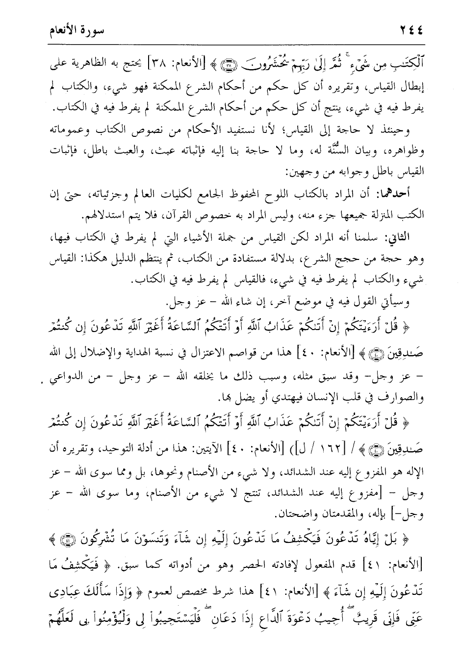 {قُلْ أَرَأَيْتَكُمْ إِنْ أَتاكُمْ عَذابُ اللهِ أَوْ أَتَتْكُمُ السّاعَةُ أَغَيْرَ اللهِ تَدْعُونَ إِنْ كُنْتُمْ صادِقِينَ} (40) [الأنعام: 40] هذا من قواصم الاعتزال في نسبة الهداية والإضلال إلى الله -عز وجل-وقد سبق مثله، وسبب ذلك ما يخلقه الله-عز وجل-من الدواعي.