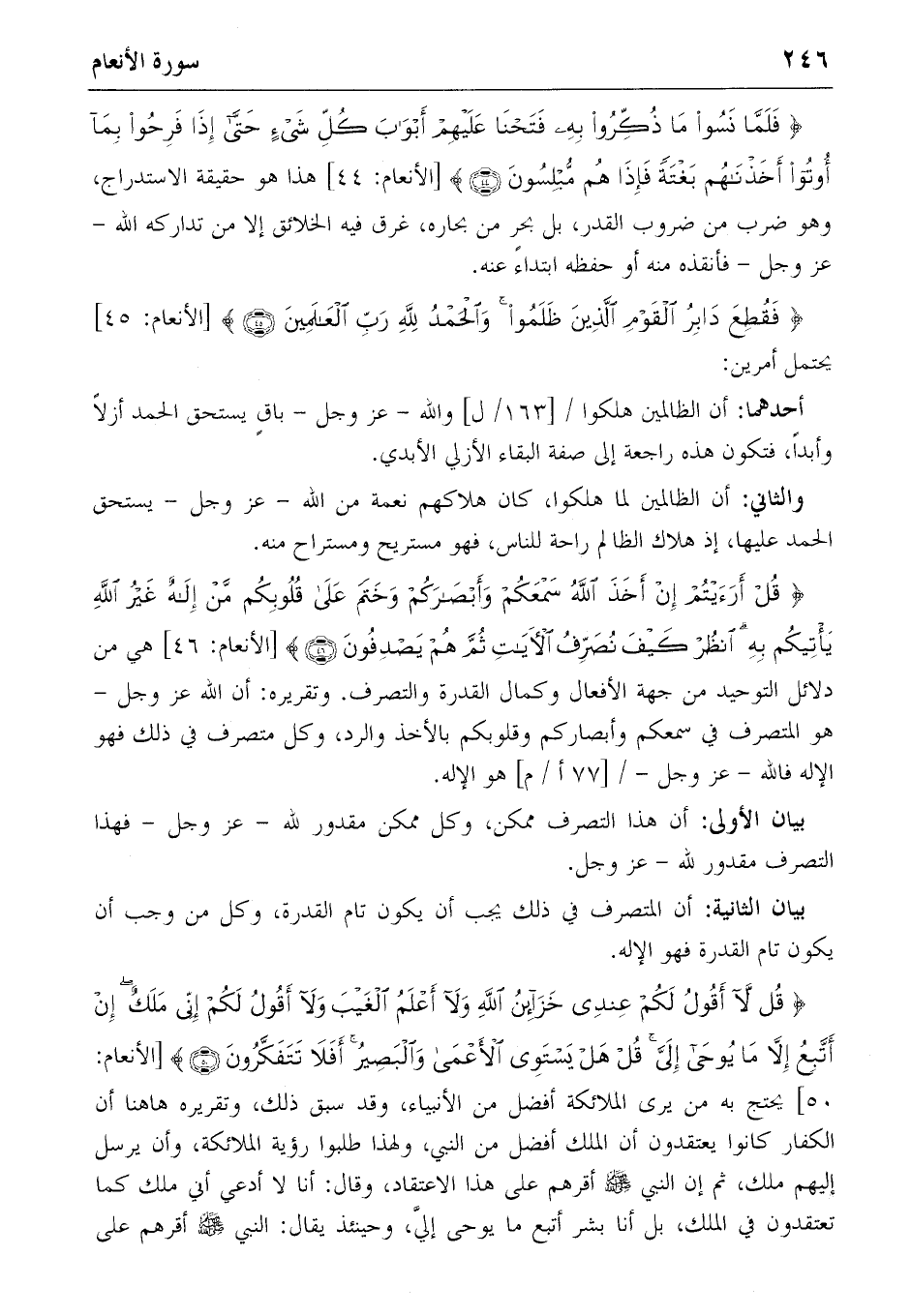 {قُلْ أَرَأَيْتُمْ إِنْ أَخَذَ اللهُ سَمْعَكُمْ وَأَبْصارَكُمْ وَخَتَمَ عَلى قُلُوبِكُمْ مَنْ إِلهٌ غَيْرُ اللهِ يَأْتِيكُمْ بِهِ اُنْظُرْ كَيْفَ نُصَرِّفُ الْآياتِ ثُمَّ هُمْ يَصْدِفُونَ} (46) [الأنعام: 46] هي من دلائل التوحيد من جهة الأفعال وكمال القدرة والتصرف. وتقريره: أن الله عز وجل- هو المتصرف في سمعكم وأبصاركم وقلوبكم بالأخذ والرد، وكل متصرف في ذلك فهو الإله فالله-عز وجل-/ [77 أ/م] هو الإله.