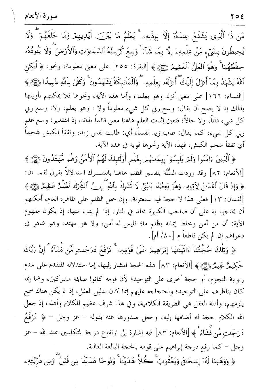 {وَتِلْكَ حُجَّتُنا آتَيْناها إِبْراهِيمَ عَلى قَوْمِهِ نَرْفَعُ دَرَجاتٍ مَنْ نَشاءُ إِنَّ رَبَّكَ حَكِيمٌ عَلِيمٌ} (83) [الأنعام: 83] هذه الحجة المشار إليها، إما استدلاله المتقدم على عدم ربوبية النجوم، أو حجة أخرى على التوحيد؛ لأن قومه كانوا صابئة مشركين، وهما إنما كان يناظرهم على التوحيد؛ واحتجاجه عليهم إنما كان بدليل العقل، إذ لم يكن هناك سمع يلزمهم، وأدلة العقل هي الطريقة الكلامية، وفي هذا شرف عظيم للكلام وأهله، إذ جعل الله الكلام حجة له أضافها إليه، وجعل صدورها عنه بقوله-عز وجل- {نَرْفَعُ دَرَجاتٍ مَنْ نَشاءُ} [الأنعام: 83] فيه إشارة إلى ارتفاع درجة المتكلمين عند الله-عز وجل-كما رفع درجة إبراهيم على قومه بالحجة البالغة الغالبة.