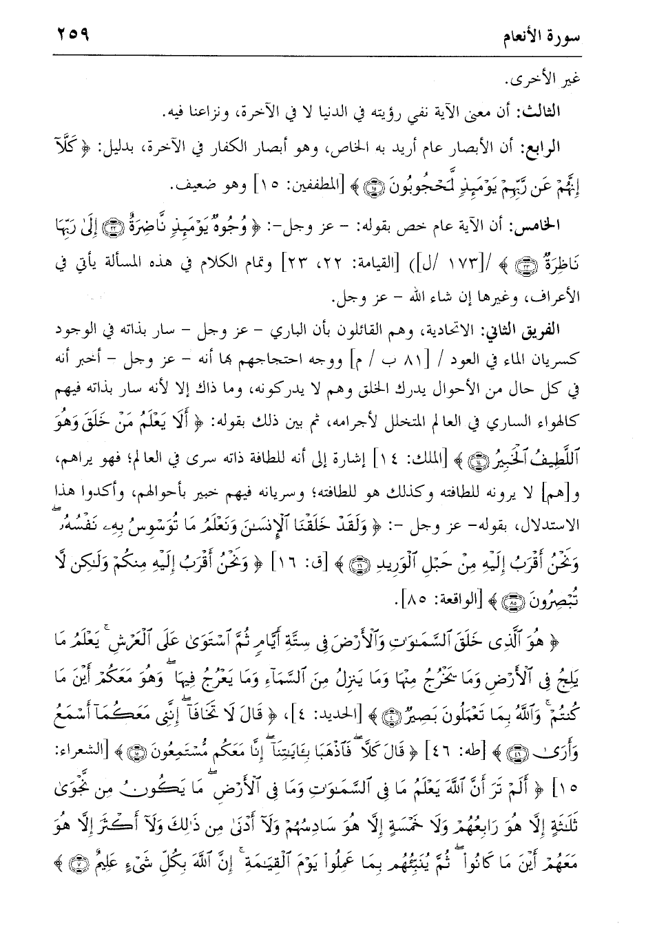 الفريق الثاني: الاتحادية، وهم القائلون بأن الباري-عز وجل-سار بذاته في الوجود كسريان الماء في العود/ [81 ب/م] ووجه احتجاجهم بها أنه-عز وجل-أخبر أنه في كل حال من الأحوال يدرك الخلق وهم لا يدركونه، وما ذاك إلا لأنه سار بذاته فيهم كالهواء الساري في العالم المتخلل لأجرامه، ثم بين ذلك بقوله: {أَلا يَعْلَمُ مَنْ خَلَقَ وَهُوَ اللَّطِيفُ الْخَبِيرُ} (14) [الملك: 14] إشارة إلى أنه للطافة ذاته سرى في العالم؛ فهو يراهم، و [هم] لا يرونه للطافته وكذلك هو للطافته؛ وسريانه فيهم خبير بأحوالهم، وأكدوا هذا الاستدلال، بقوله-عز وجل-: {وَلَقَدْ خَلَقْنَا الْإِنْسانَ وَنَعْلَمُ ما تُوَسْوِسُ بِهِ نَفْسُهُ وَنَحْنُ أَقْرَبُ إِلَيْهِ مِنْ حَبْلِ الْوَرِيدِ} (16) [ق: 16] {وَنَحْنُ أَقْرَبُ إِلَيْهِ مِنْكُمْ وَلكِنْ لا تُبْصِرُونَ} (85) [الواقعة: 85].