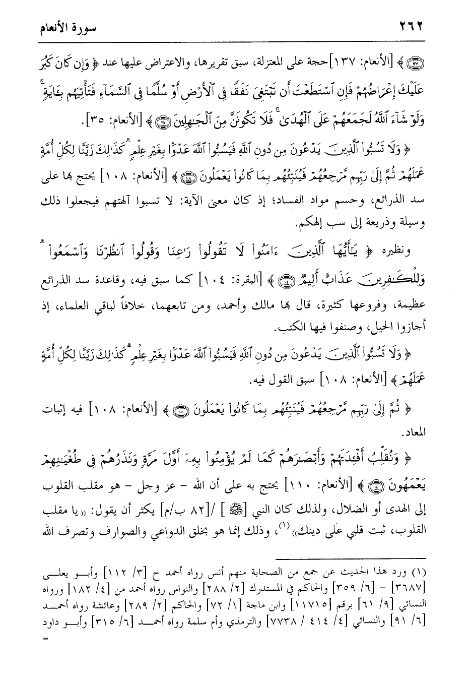 {وَلا تَسُبُّوا الَّذِينَ يَدْعُونَ مِنْ دُونِ اللهِ فَيَسُبُّوا اللهَ عَدْواً بِغَيْرِ عِلْمٍ كَذلِكَ زَيَّنّا لِكُلِّ أُمَّةٍ عَمَلَهُمْ ثُمَّ إِلى رَبِّهِمْ مَرْجِعُهُمْ فَيُنَبِّئُهُمْ بِما كانُوا يَعْمَلُونَ} (108) [الأنعام: 108] يحتج بها على سد الذرائع، وحسم مواد الفساد؛ إذ كان معنى الآية: لا تسبوا آلهتهم فيجعلوا ذلك وسيلة وذريعة إلى سب إلهكم.
