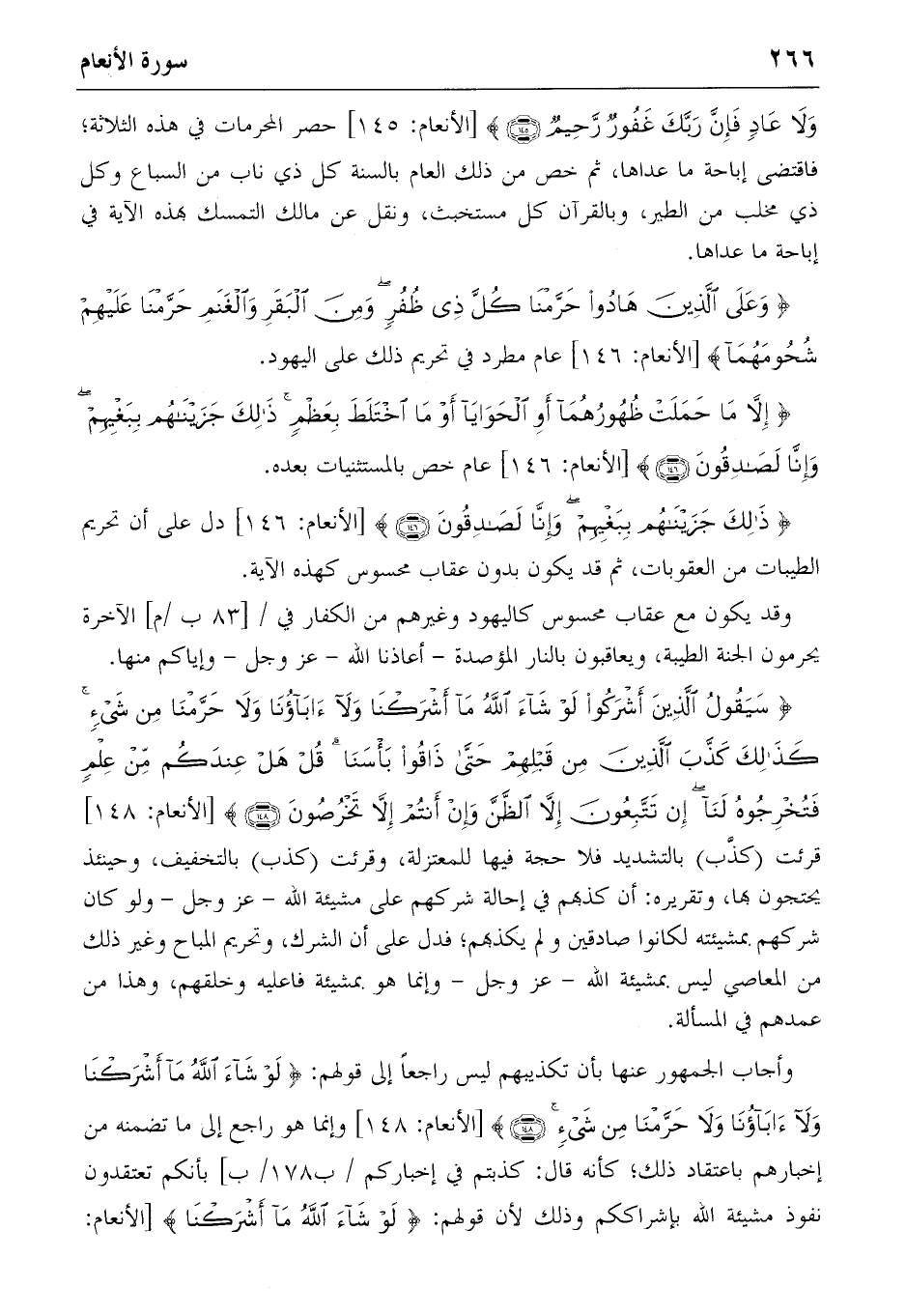 {سَيَقُولُ الَّذِينَ أَشْرَكُوا لَوْ شاءَ اللهُ ما أَشْرَكْنا وَلا آباؤُنا وَلا حَرَّمْنا مِنْ شَيْءٍ كَذلِكَ كَذَّبَ الَّذِينَ مِنْ قَبْلِهِمْ حَتّى ذاقُوا بَأْسَنا قُلْ هَلْ عِنْدَكُمْ مِنْ عِلْمٍ فَتُخْرِجُوهُ لَنا إِنْ تَتَّبِعُونَ إِلاَّ الظَّنَّ وَإِنْ أَنْتُمْ إِلاّ تَخْرُصُونَ} (148) [الأنعام: 148] قرئت (كذّب) بالتشديد فلا حجة فيها للمعتزلة، وقرئت (كذب) بالتخفيف، وحينئذ يحتجون بها، وتقريره: أن كذبهم في إحالة شركهم على مشيئة الله-عز وجل-ولو كان شركهم بمشيئته لكانوا صادقين ولم يكذبهم؛ فدل على أن الشرك، وتحريم المباح وغير ذلك من المعاصي ليس بمشيئة الله-عز وجل-وإنما هو بمشيئة فاعليه وخلقهم، وهذا من عمدهم في المسألة.