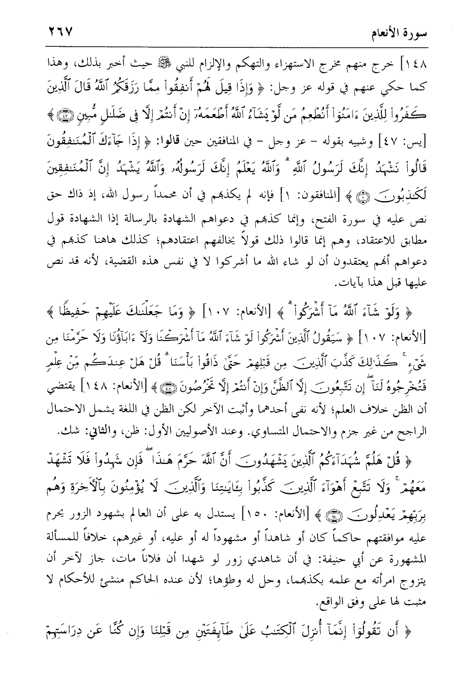 {قُلْ هَلُمَّ شُهَداءَكُمُ الَّذِينَ يَشْهَدُونَ أَنَّ اللهَ حَرَّمَ هذا فَإِنْ شَهِدُوا فَلا تَشْهَدْ مَعَهُمْ وَلا تَتَّبِعْ أَهْواءَ الَّذِينَ كَذَّبُوا بِآياتِنا وَالَّذِينَ لا يُؤْمِنُونَ بِالْآخِرَةِ وَهُمْ بِرَبِّهِمْ يَعْدِلُونَ} (150) [الأنعام: 150] يستدل به على أن العالم بشهود الزور يحرم عليه موافقتهم حاكما كان أو شاهدا أو مشهودا له أو عليه، أو غيرهم، خلافا للمسألة المشهورة عن أبي حنيفة: في أن شاهدي زور لو شهدا أن فلانا مات، جاز لآخر أن يتزوج امرأته مع علمه بكذبهما، وحل له وطؤها؛ لأن عنده الحاكم منشئ للأحكام لا مثبت لها على وفق الواقع.