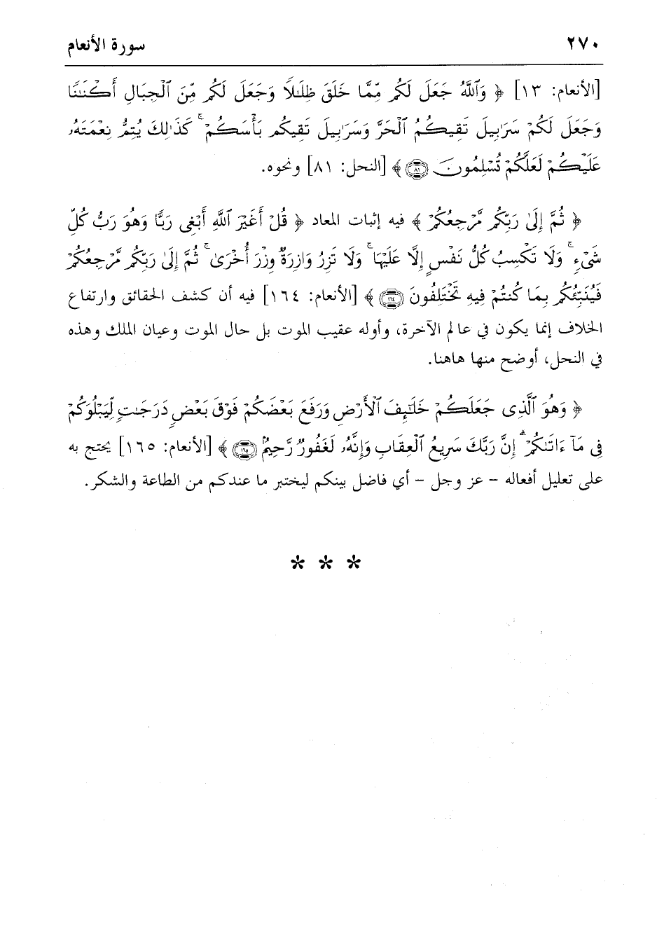 [الأنعام: 13] {وَاللهُ جَعَلَ لَكُمْ مِمّا خَلَقَ ظِلالاً وَجَعَلَ لَكُمْ مِنَ الْجِبالِ أَكْناناً وَجَعَلَ لَكُمْ سَرابِيلَ تَقِيكُمُ الْحَرَّ وَسَرابِيلَ تَقِيكُمْ بَأْسَكُمْ كَذلِكَ يُتِمُّ نِعْمَتَهُ عَلَيْكُمْ لَعَلَّكُمْ تُسْلِمُونَ} (81) [النحل: 81] ونحوه.