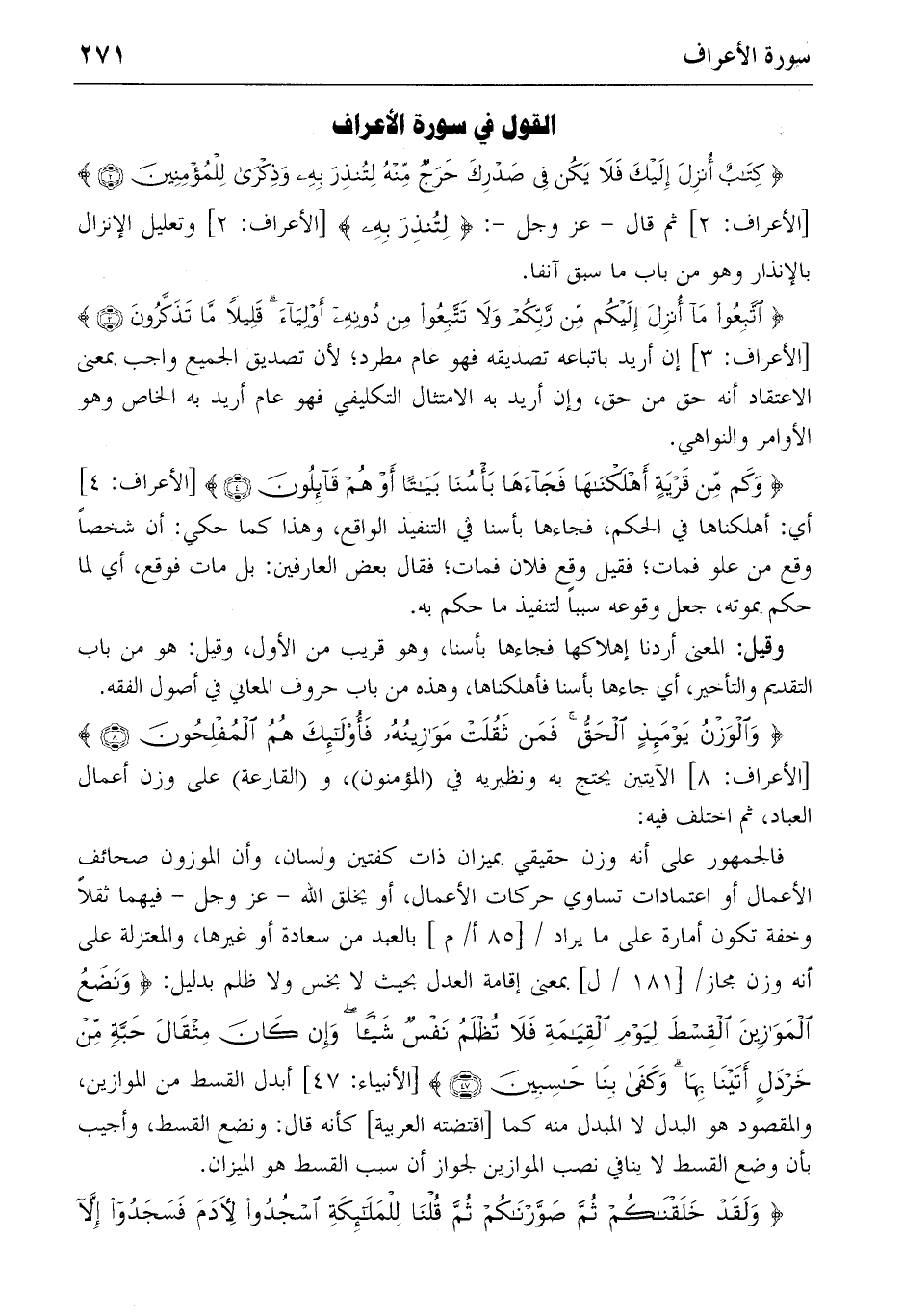 {وَالْوَزْنُ يَوْمَئِذٍ الْحَقُّ فَمَنْ ثَقُلَتْ مَوازِينُهُ فَأُولئِكَ هُمُ الْمُفْلِحُونَ} (8) [الأعراف: 8] الآيتين يحتج به ونظيريه في (المؤمنون)، و (القارعة) على وزن أعمال العباد، ثم اختلف فيه: