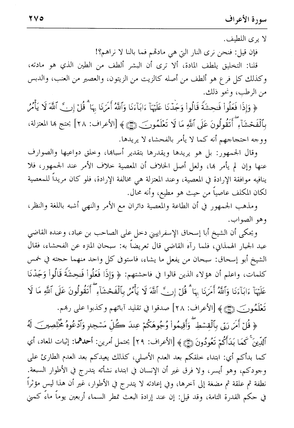 ويحكى أن الشيخ أبا إسحاق الإسفراييني دخل على الصاحب بن عباد، وعنده القاضي عبد الجبار الهمذاني، فلما رآه القاضي قال تعريضا به: سبحان المنزه عن الفحشاء، فقال الشيخ أبو إسحاق: سبحان من يفعل ما يشاء، فاستوفى كل واحد منهما حجته في خمس كلمات، واعلم أن هؤلاء الذين قالوا في فاحشتهم: {وَإِذا فَعَلُوا فاحِشَةً قالُوا وَجَدْنا عَلَيْها آباءَنا وَاللهُ أَمَرَنا بِها قُلْ إِنَّ اللهَ لا يَأْمُرُ بِالْفَحْشاءِ أَتَقُولُونَ عَلَى اللهِ ما لا تَعْلَمُونَ} (28) [الأعراف: 28] صدقوا في تقليد آبائهم وكذبوا على ربهم.