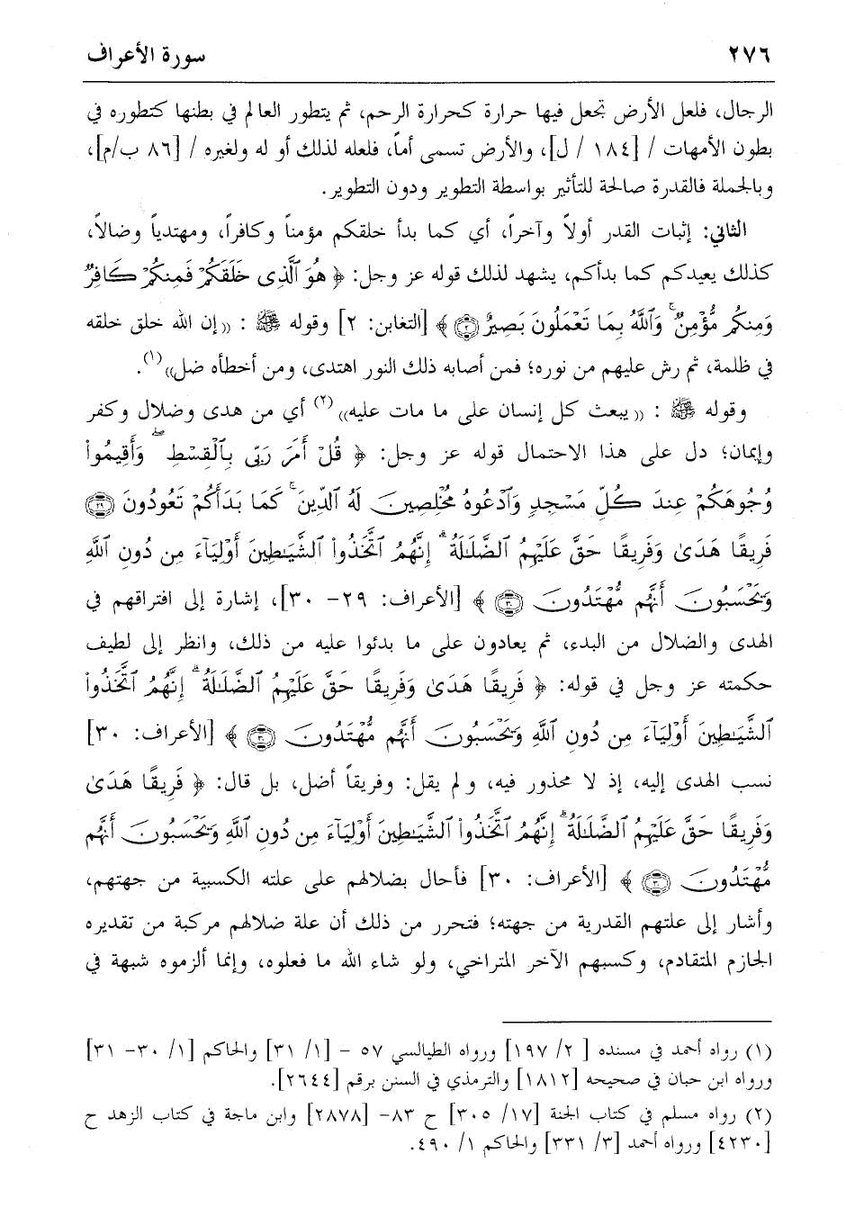 وقوله صلّى الله عليه وسلّم: «يبعث كل إنسان على ما مات عليه» (2) أي من هدى وضلال وكفر وإيمان؛ دل على هذا الاحتمال قوله عز وجل: {قُلْ أَمَرَ رَبِّي بِالْقِسْطِ وَأَقِيمُوا وُجُوهَكُمْ عِنْدَ كُلِّ مَسْجِدٍ وَاُدْعُوهُ مُخْلِصِينَ لَهُ الدِّينَ كَما بَدَأَكُمْ تَعُودُونَ (29) فَرِيقاً هَدى وَفَرِيقاً حَقَّ عَلَيْهِمُ الضَّلالَةُ إِنَّهُمُ اِتَّخَذُوا الشَّياطِينَ أَوْلِياءَ مِنْ دُونِ اللهِ وَيَحْسَبُونَ أَنَّهُمْ مُهْتَدُونَ} (30) [الأعراف: 29 - 30]، إشارة إلى افتراقهم في الهدى والضلال من البدء، ثم يعادون على ما بدئوا عليه من ذلك، وانظر إلى لطيف حكمته عز وجل في قوله: {فَرِيقاً هَدى وَفَرِيقاً حَقَّ عَلَيْهِمُ الضَّلالَةُ إِنَّهُمُ اِتَّخَذُوا الشَّياطِينَ أَوْلِياءَ مِنْ دُونِ اللهِ وَيَحْسَبُونَ أَنَّهُمْ مُهْتَدُونَ} (30) [الأعراف: 30] نسب الهدى إليه، إذ لا محذور فيه، ولم يقل: وفريقا أضل، بل قال: {فَرِيقاً هَدى وَفَرِيقاً حَقَّ عَلَيْهِمُ الضَّلالَةُ إِنَّهُمُ اِتَّخَذُوا الشَّياطِينَ أَوْلِياءَ مِنْ دُونِ اللهِ وَيَحْسَبُونَ أَنَّهُمْ مُهْتَدُونَ} (30) [الأعراف: 30] فأحال بضلالهم على علته الكسبية من جهتهم، وأشار إلى علتهم القدرية من جهته؛ فتحرر من ذلك أن علة ضلالهم مركبة من تقديره الجازم المتقادم، وكسبهم الآخر المتراخي، ولو شاء الله ما فعلوه، وإنما ألزموه شبهة في