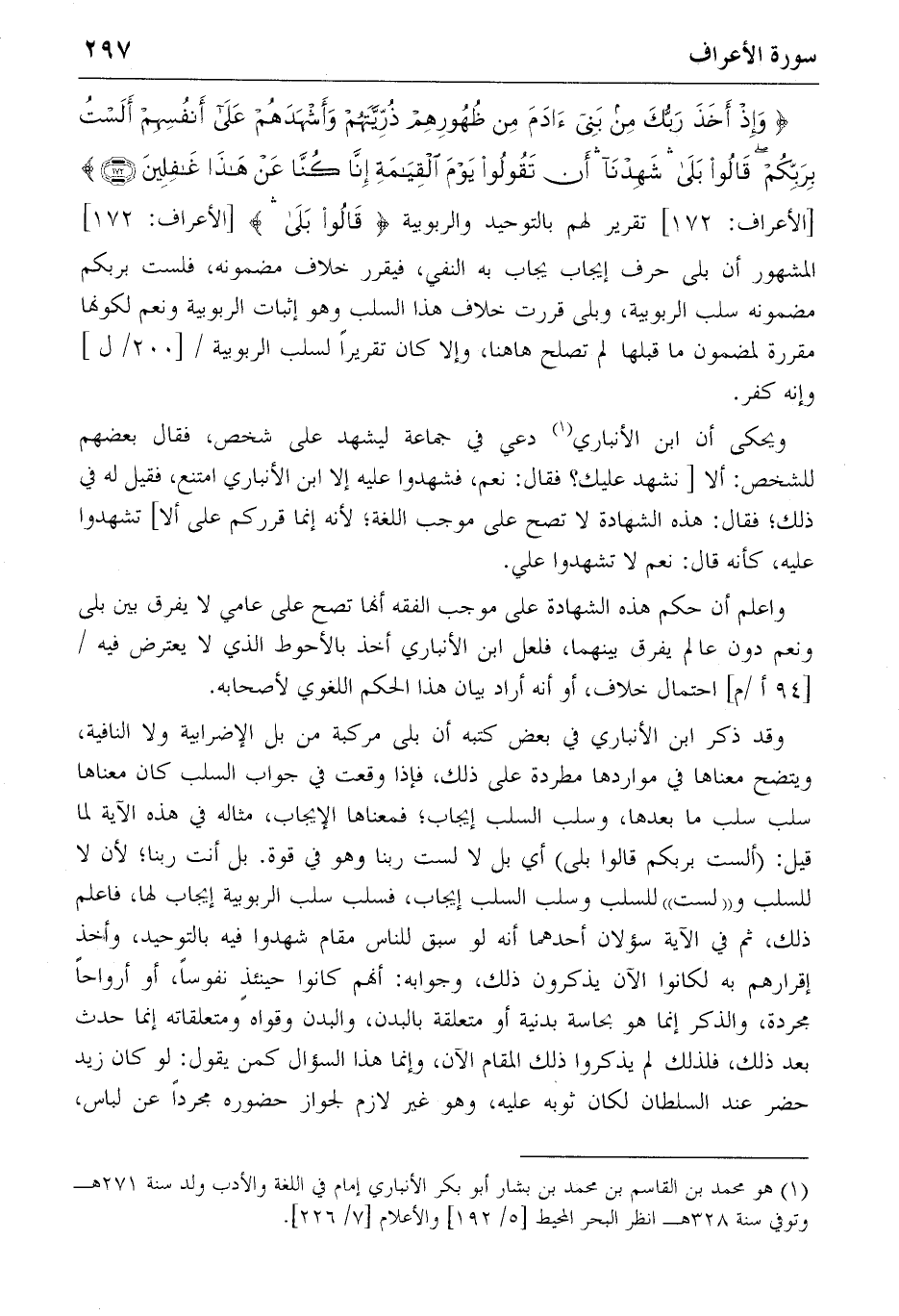 وقد ذكر ابن الأنباري في بعض كتبه أن بلى مركبة من بل الإضرابية ولا النافية، ويتضح معناها في مواردها مطردة على ذلك، فإذا وقعت في جواب السلب كان معناها سلب سلب ما بعدها، وسلب السلب إيجاب؛ فمعناها الإيجاب، مثاله في هذه الآية لما قيل: (ألست بربكم قالوا بلى) أي بل لا لست ربنا وهو في قوة. بل أنت ربنا؛ لأن لا للسلب و «لست» للسلب وسلب السلب إيجاب، فسلب سلب الربوبية إيجاب لها، فاعلم ذلك، ثم في الآية سؤلان أحدهما أنه لو سبق للناس مقام شهدوا فيه بالتوحيد، وأخذ إقرارهم به لكانوا الآن يذكرون ذلك، وجوابه: أنهم كانوا حينئذ نفوسا، أو أرواحا مجردة، والذكر إنما هو بحاسة بدنية أو متعلقة بالبدن، والبدن وقواه ومتعلقاته إنما حدث بعد ذلك، فلذلك لم يذكروا ذلك المقام الآن، وإنما هذا السؤال كمن يقول: لو كان زيد حضر عند السلطان لكان ثوبه عليه، وهو غير لازم لجواز حضوره مجردا عن لباس،