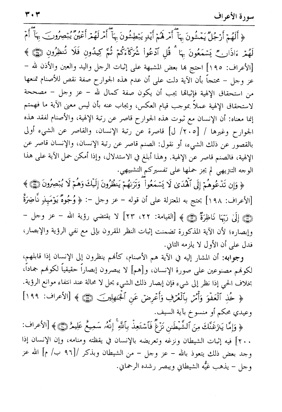 {أَلَهُمْ أَرْجُلٌ يَمْشُونَ بِها أَمْ لَهُمْ أَيْدٍ يَبْطِشُونَ بِها أَمْ لَهُمْ أَعْيُنٌ يُبْصِرُونَ بِها أَمْ لَهُمْ آذانٌ يَسْمَعُونَ بِها قُلِ اُدْعُوا شُرَكاءَكُمْ ثُمَّ كِيدُونِ فَلا تُنْظِرُونِ} (195) [الأعراف: 195] احتج بها بعض المشبهة على إثبات الرجل واليد والعين والأذن لله- عز وجل-محتجا بأن الآية دلت على أن عدم هذه الجوارح صفة نقص للأصنام تمنعها من استحقاق الإلهية فإثباتها يجب أن يكون صفة كمال لله-عز وجل-مصححة لاستحقاق الإلهية عملا بموجب قيام العكس، ويجاب عنه بأن ليس معنى الآية ما فهمتم إنما معناه: أن الإنسان مع ثبوت هذه الجوارح قاصر عن رتبة الإلهية، والأصنام لفقد هذه الجوارح وغيرها/ [205/ل] قاصرة عن رتبة الإنسان، والقاصر عن الشيء أولى بالقصور عن ذلك الشيء، أو نقول: الصنم قاصر عن رتبة الإنسان، والإنسان قاصر عن الإلهية، فالصنم قاصر عن الإلهية. وهذا أبلغ في الاستدلال، وإذا أمكن حمل الآية على هذا الوجه التنزيهي لم يجز حملها على تفسيركم التشبيهي.