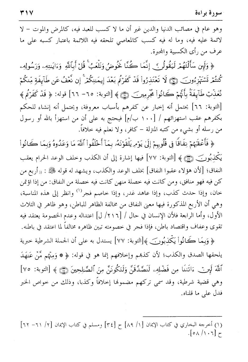 {وَبِما كانُوا يَكْذِبُونَ} [التوبة: 77] يستدل به على أن الجملة الشرطية خبرية يلحقها الصدق والكذب؛ لأن كذبهم وإخلافهم إنما هو في قوله: {*وَمِنْهُمْ مَنْ عاهَدَ اللهَ لَئِنْ آتانا مِنْ فَضْلِهِ لَنَصَّدَّقَنَّ وَلَنَكُونَنَّ مِنَ الصّالِحِينَ} (75) [التوبة: 75] وهي قضية شرطية، وقد سمى تركهم مضمونها إخلافا وكذبا، وذلك من خواص الخبر فدل على ما قلناه.