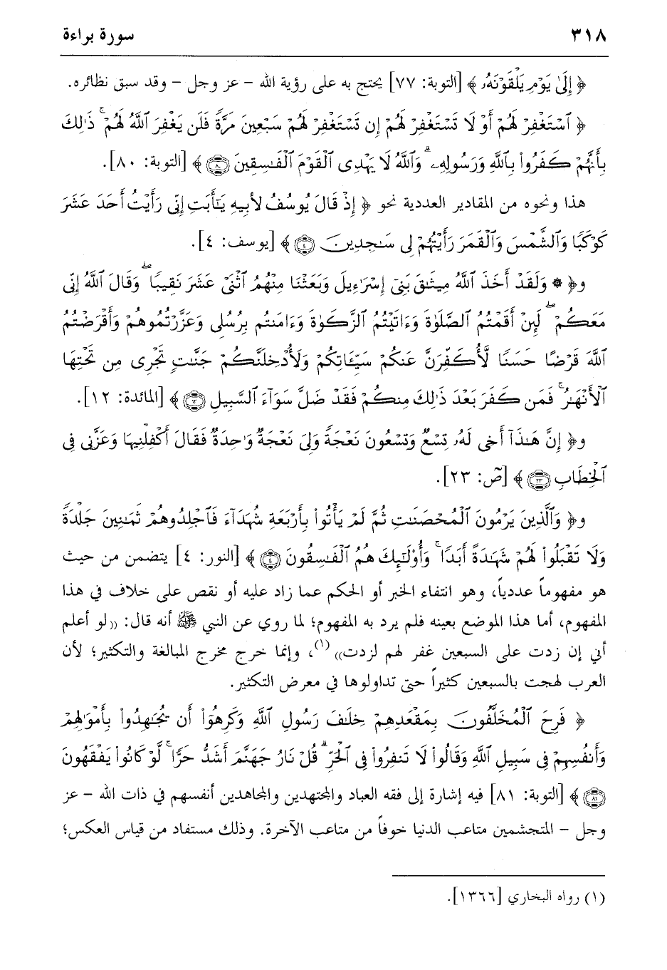 و{وَالَّذِينَ يَرْمُونَ الْمُحْصَناتِ ثُمَّ لَمْ يَأْتُوا بِأَرْبَعَةِ شُهَداءَ فَاجْلِدُوهُمْ ثَمانِينَ جَلْدَةً وَلا تَقْبَلُوا لَهُمْ شَهادَةً أَبَداً وَأُولئِكَ هُمُ الْفاسِقُونَ} (4) [النور: 4] يتضمن من حيث هو مفهوما عدديا، وهو انتفاء الخبر أو الحكم عما زاد عليه أو نقص على خلاف في هذا المفهوم، أما هذا الموضع بعينه فلم يرد به المفهوم؛ لما روي عن النبي صلّى الله عليه وسلّم أنه قال: «لو أعلم أني إن زدت على السبعين غفر لهم لزدت» (1)، وإنما خرج مخرج المبالغة والتكثير؛ لأن العرب لهجت بالسبعين كثيرا حتى تداولوها في معرض التكثير.