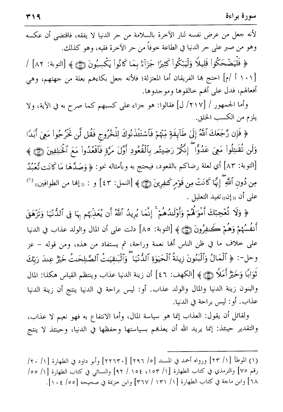 {وَلا تُعْجِبْكَ أَمْوالُهُمْ وَأَوْلادُهُمْ إِنَّما يُرِيدُ اللهُ أَنْ يُعَذِّبَهُمْ بِها فِي الدُّنْيا وَتَزْهَقَ أَنْفُسُهُمْ وَهُمْ كافِرُونَ} (85) [التوبة: 85] دلت على أن المال والولد عذاب في الدنيا على خلاف ما في ظن الناس أنها نعمة وراحة، ثم يستفاد من هذه، ومن قوله-عز وجل-: {الْمالُ وَالْبَنُونَ زِينَةُ الْحَياةِ الدُّنْيا وَالْباقِياتُ الصّالِحاتُ خَيْرٌ عِنْدَ رَبِّكَ ثَواباً وَخَيْرٌ أَمَلاً} (46) [الكهف: 46] أن زينة الدنيا عذاب وينتظم القياس هكذا: المال والبنون زينة الدنيا والمال والولد عذاب. أو: ليس براحة في الدنيا ينتج أن زينة الدنيا عذاب. أو: ليس براحة في الدنيا.