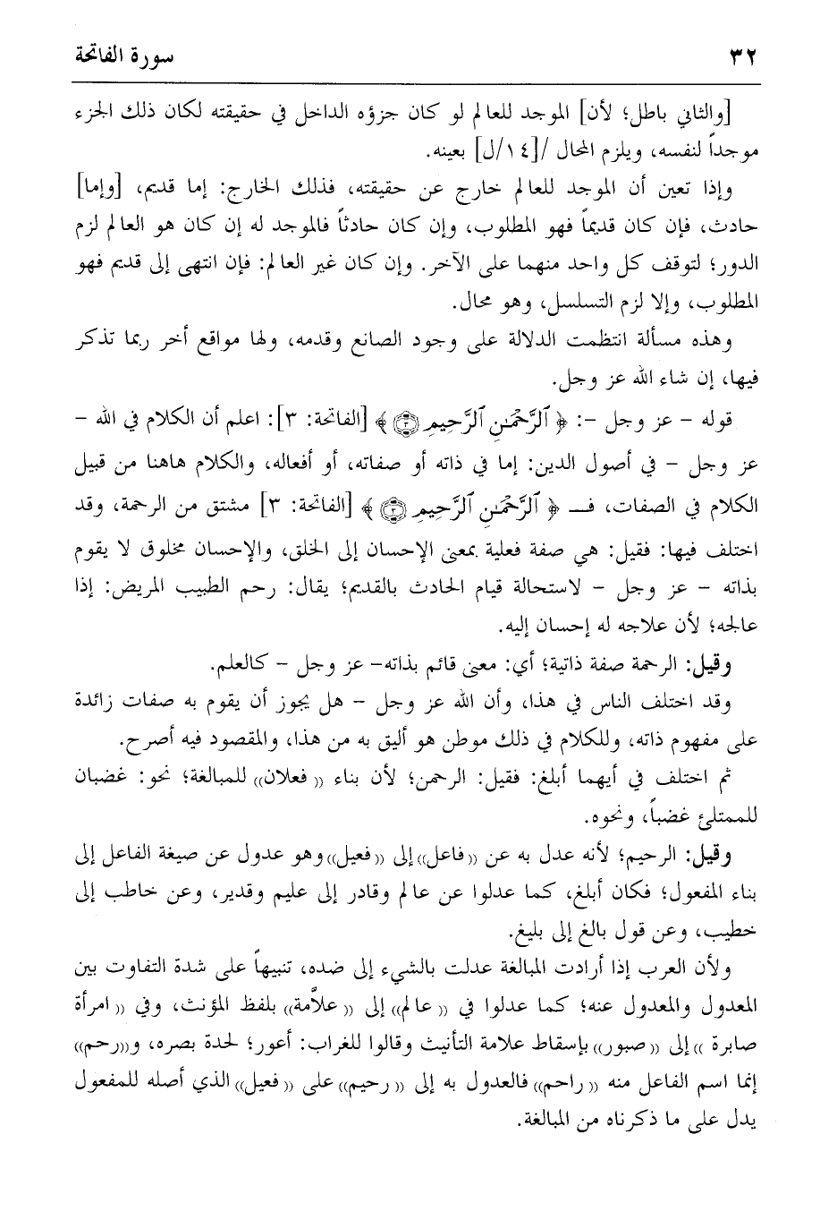 قوله-عز وجل-: {الرَّحْمنِ الرَّحِيمِ} (3) [الفاتحة: 3]: اعلم أن الكلام في الله- عز وجل-في أصول الدين: إما في ذاته أو صفاته، أو أفعاله، والكلام هاهنا من قبيل الكلام في الصفات، ف {الرَّحْمنِ الرَّحِيمِ} (3) [الفاتحة: 3] مشتق من الرحمة، وقد اختلف فيها: فقيل: هي صفة فعلية بمعنى الإحسان إلى الخلق، والإحسان مخلوق لا يقوم بذاته-عز وجل-لاستحالة قيام الحادث بالقديم؛ يقال: رحم الطبيب المريض: إذا عالجه؛ لأن علاجه له إحسان إليه.