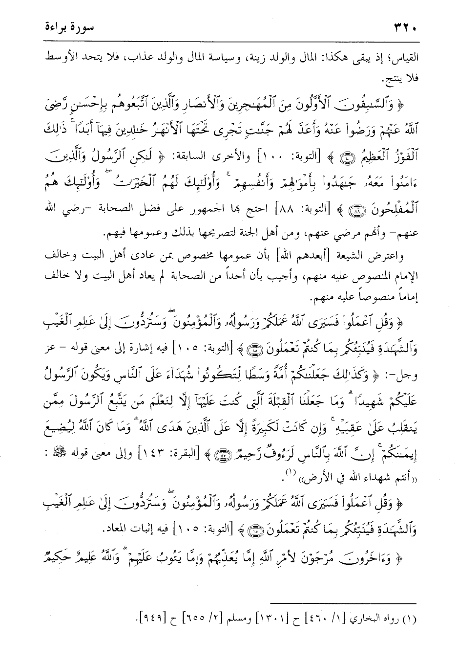 {وَقُلِ اِعْمَلُوا فَسَيَرَى اللهُ عَمَلَكُمْ وَرَسُولُهُ وَالْمُؤْمِنُونَ وَسَتُرَدُّونَ إِلى عالِمِ الْغَيْبِ وَالشَّهادَةِ فَيُنَبِّئُكُمْ بِما كُنْتُمْ تَعْمَلُونَ} (105) [التوبة: 105] فيه إشارة إلى معنى قوله-عز وجل-: {وَكَذلِكَ جَعَلْناكُمْ أُمَّةً وَسَطاً لِتَكُونُوا شُهَداءَ عَلَى النّاسِ وَيَكُونَ الرَّسُولُ عَلَيْكُمْ شَهِيداً وَما جَعَلْنَا الْقِبْلَةَ الَّتِي كُنْتَ عَلَيْها إِلاّ لِنَعْلَمَ مَنْ يَتَّبِعُ الرَّسُولَ مِمَّنْ يَنْقَلِبُ عَلى عَقِبَيْهِ وَإِنْ كانَتْ لَكَبِيرَةً إِلاّ عَلَى الَّذِينَ هَدَى اللهُ وَما كانَ اللهُ لِيُضِيعَ إِيمانَكُمْ إِنَّ اللهَ بِالنّاسِ لَرَؤُفٌ رَحِيمٌ} (143) [البقرة: 143] وإلى معنى قوله صلّى الله عليه وسلّم: