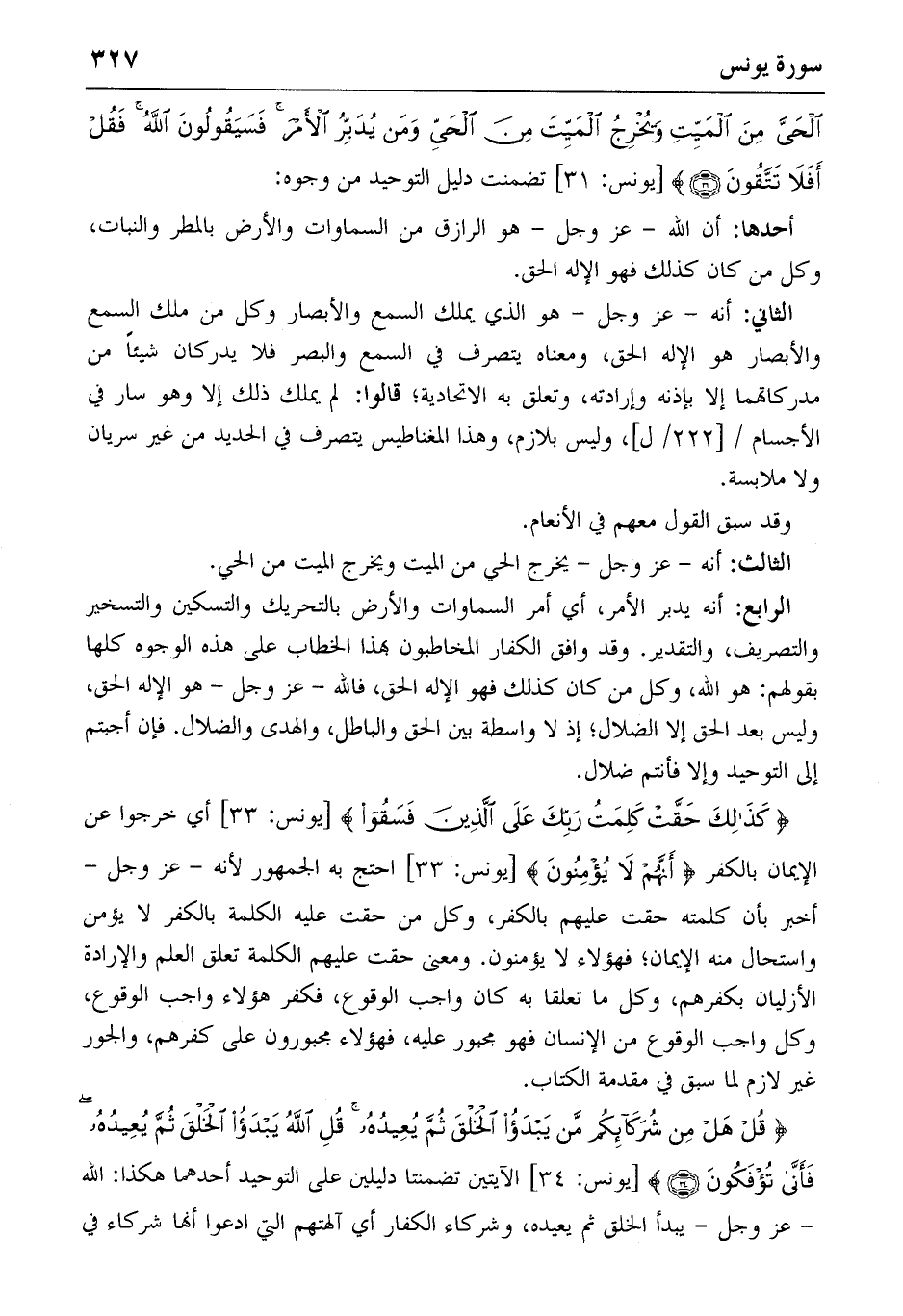 الْحَيَّ مِنَ الْمَيِّتِ وَيُخْرِجُ الْمَيِّتَ مِنَ الْحَيِّ وَمَنْ يُدَبِّرُ الْأَمْرَ فَسَيَقُولُونَ اللهُ فَقُلْ أَفَلا تَتَّقُونَ (31) [يونس: 31] تضمنت دليل التوحيد من وجوه: