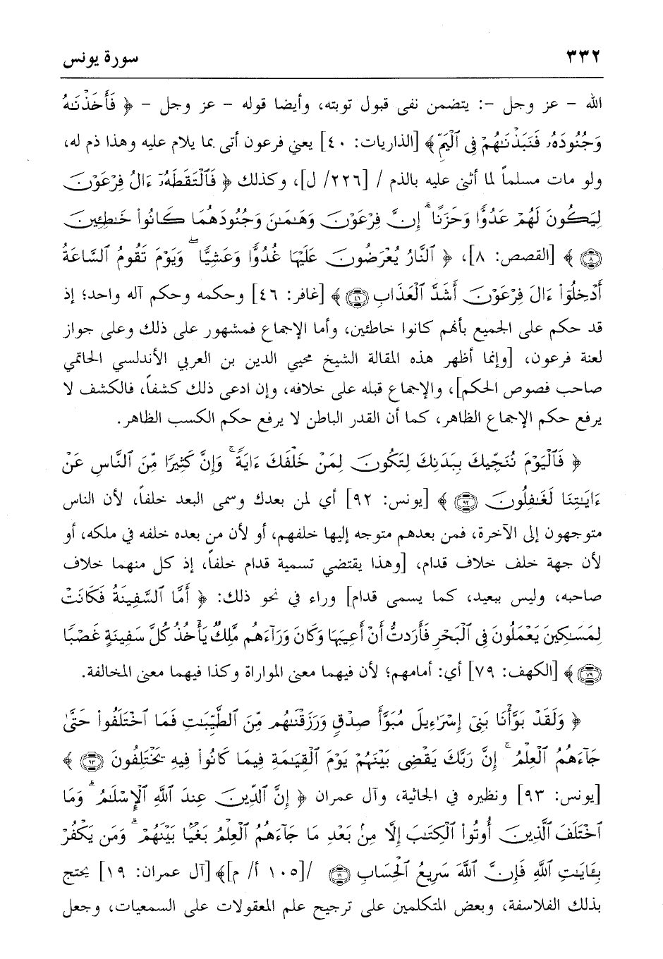 الله-عز وجل-: يتضمن نفى قبول توبته، وأيضا قوله-عز وجل- {فَأَخَذْناهُ وَجُنُودَهُ فَنَبَذْناهُمْ فِي الْيَمِّ} [الذاريات: 40] يعني فرعون أتى بما يلام عليه وهذا ذم له، ولو مات مسلما لما أثنى عليه بالذم/ [226/ل]، وكذلك {فَالْتَقَطَهُ آلُ فِرْعَوْنَ لِيَكُونَ لَهُمْ عَدُوًّا وَحَزَناً إِنَّ فِرْعَوْنَ وَهامانَ وَجُنُودَهُما كانُوا خاطِئِينَ} (8) [القصص: 8]، {النّارُ يُعْرَضُونَ عَلَيْها غُدُوًّا وَعَشِيًّا وَيَوْمَ تَقُومُ السّاعَةُ أَدْخِلُوا آلَ فِرْعَوْنَ أَشَدَّ الْعَذابِ} (46) [غافر: 46] وحكمه وحكم آله واحد؛ إذ قد حكم على الجميع بأنهم كانوا خاطئين، وأما الإجماع فمشهور على ذلك وعلى جواز لعنة فرعون، [وإنما أظهر هذه المقالة الشيخ محيي الدين بن العربي الأندلسي الحاتمي صاحب فصوص الحكم]، والإجماع قبله على خلافه، وإن ادعى ذلك كشفا، فالكشف لا يرفع حكم الإجماع الظاهر، كما أن القدر الباطن لا يرفع حكم الكسب الظاهر.