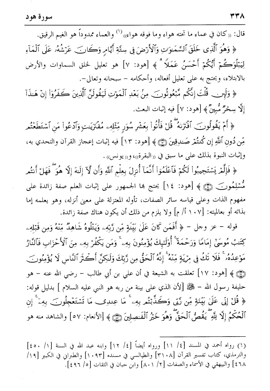 قوله-عز وجل- {أَفَمَنْ كانَ عَلى بَيِّنَةٍ مِنْ رَبِّهِ وَيَتْلُوهُ شاهِدٌ مِنْهُ وَمِنْ قَبْلِهِ كِتابُ مُوسى إِماماً وَرَحْمَةً أُولئِكَ يُؤْمِنُونَ بِهِ وَمَنْ يَكْفُرْ بِهِ مِنَ الْأَحْزابِ فَالنّارُ مَوْعِدُهُ فَلا تَكُ فِي مِرْيَةٍ مِنْهُ إِنَّهُ الْحَقُّ مِنْ رَبِّكَ وَلكِنَّ أَكْثَرَ النّاسِ لا يُؤْمِنُونَ} (17) [هود: 17] تعلقت به الشيعة في أن علي بن أبي طالب-رضي الله عنه-هو حليفة رسول الله-صلّى الله عليه وسلّم [لأن الذي على بينة من ربه هو النبي عليه السّلام] بدليل قوله: