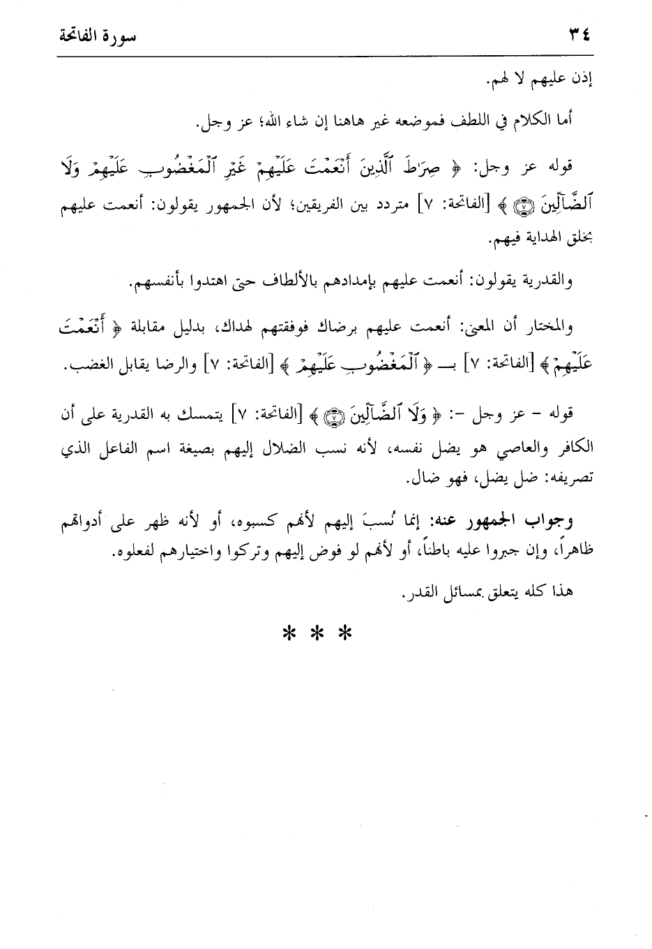 قوله عز وجل: {صِراطَ الَّذِينَ أَنْعَمْتَ عَلَيْهِمْ غَيْرِ الْمَغْضُوبِ عَلَيْهِمْ وَلا الضّالِّينَ} (7) [الفاتحة: 7] متردد بين الفريقين؛ لأن الجمهور يقولون: أنعمت عليهم بخلق الهداية فيهم.