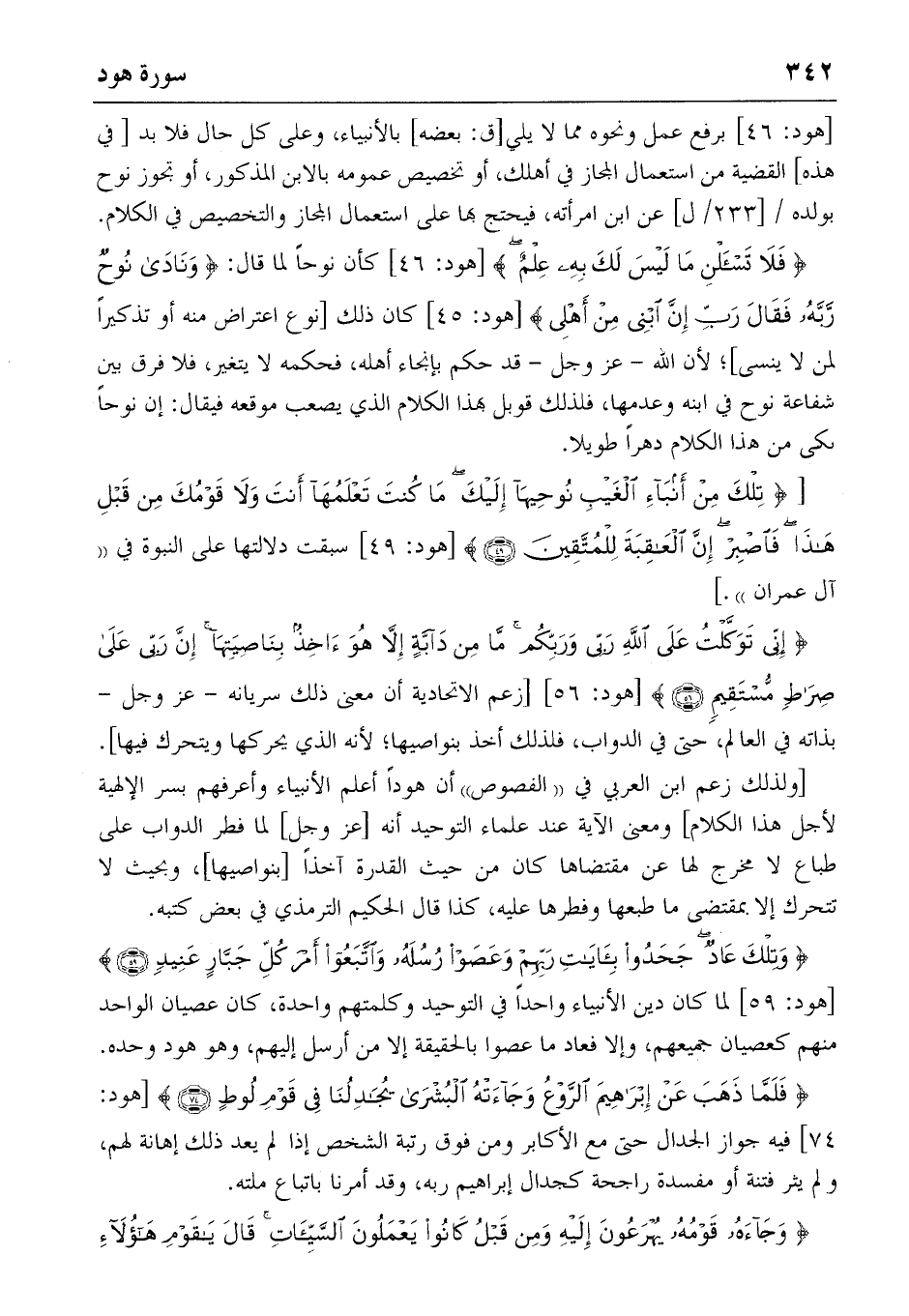 [ولذلك زعم ابن العربي في «الفصوص» أن هودا أعلم الأنبياء وأعرفهم بسر الإلهية لأجل هذا الكلام] ومعنى الآية عند علماء التوحيد أنه [عز وجل] لما فطر الدواب على طباع لا مخرج لها عن مقتضاها كان من حيث القدرة آخذا [بنواصيها]، وبحيث لا تتحرك إلا بمقتضى ما طبعها وفطرها عليه، كذا قال الحكيم الترمذي في بعض كتبه.