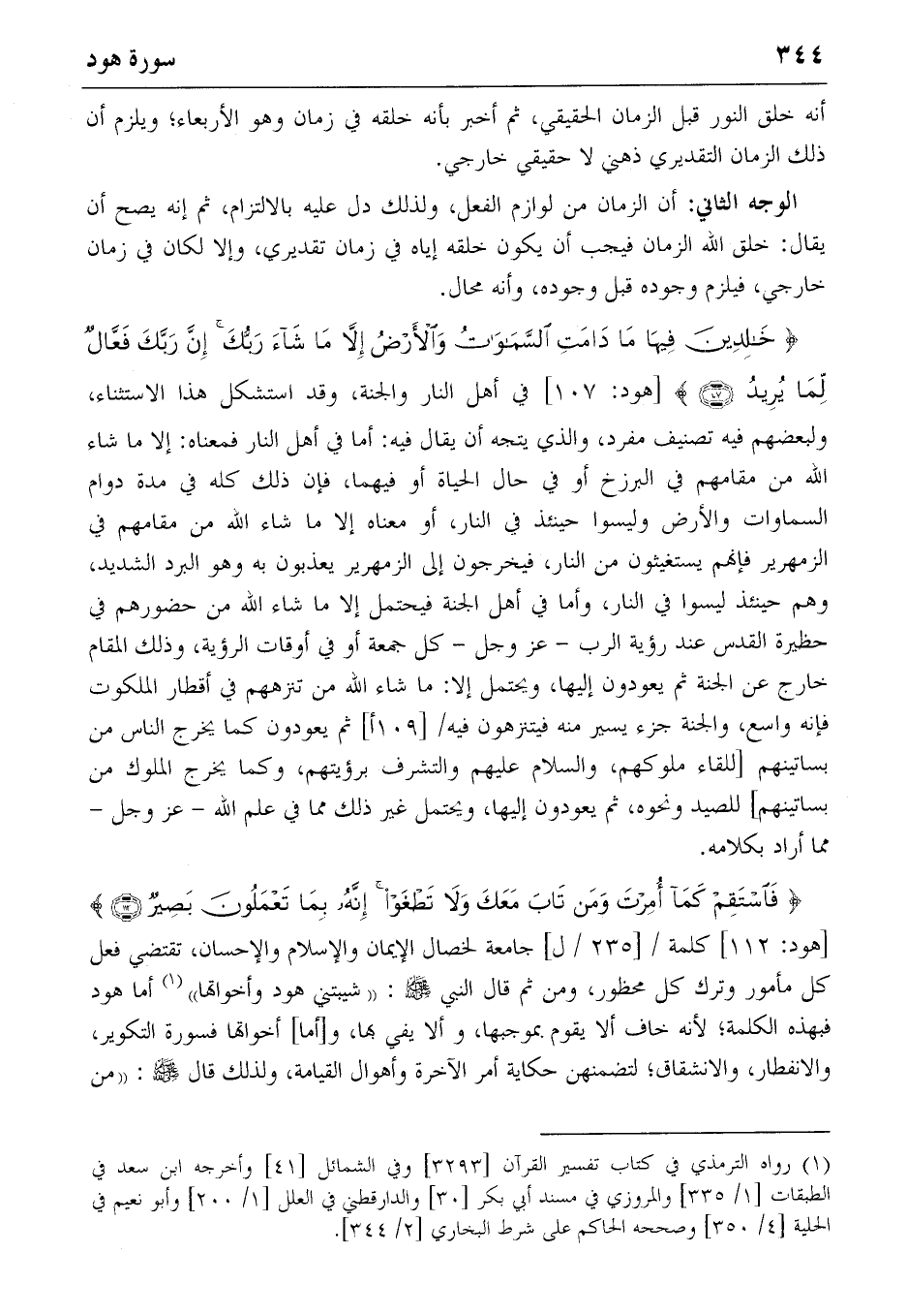 {فَاسْتَقِمْ كَما أُمِرْتَ وَمَنْ تابَ مَعَكَ وَلا تَطْغَوْا إِنَّهُ بِما تَعْمَلُونَ بَصِيرٌ} (112) [هود: 112] كلمة/ [235/ل] جامعة لخصال الإيمان والإسلام والإحسان، تقتضي فعل كل مأمور وترك كل محظور، ومن ثم قال النبي صلّى الله عليه وسلّم: «شيبتني هود وأخواتها» (1) أما هود فبهذه الكلمة؛ لأنه خاف ألا يقوم بموجبها، وألا يفي بها، و [أما] أخواتها فسورة التكوير، والانفطار، والانشقاق؛ لتضمنهن حكاية أمر الآخرة وأهوال القيامة، ولذلك قال صلّى الله عليه وسلّم: «من