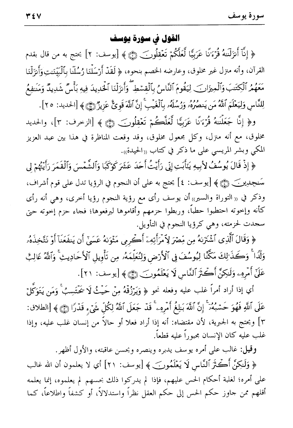 {إِنّا أَنْزَلْناهُ قُرْآناً عَرَبِيًّا لَعَلَّكُمْ تَعْقِلُونَ} (2) [يوسف: 2] يحتج به من قال بقدم القرآن، وأنه منزل غير مخلوق، وعارضه الخصم بنحوه، {لَقَدْ أَرْسَلْنا رُسُلَنا بِالْبَيِّناتِ وَأَنْزَلْنا مَعَهُمُ الْكِتابَ وَالْمِيزانَ لِيَقُومَ النّاسُ بِالْقِسْطِ وَأَنْزَلْنَا الْحَدِيدَ فِيهِ بَأْسٌ شَدِيدٌ وَمَنافِعُ لِلنّاسِ وَلِيَعْلَمَ اللهُ مَنْ يَنْصُرُهُ وَرُسُلَهُ بِالْغَيْبِ إِنَّ اللهَ قَوِيٌّ عَزِيزٌ} (25) [الحديد: 25].