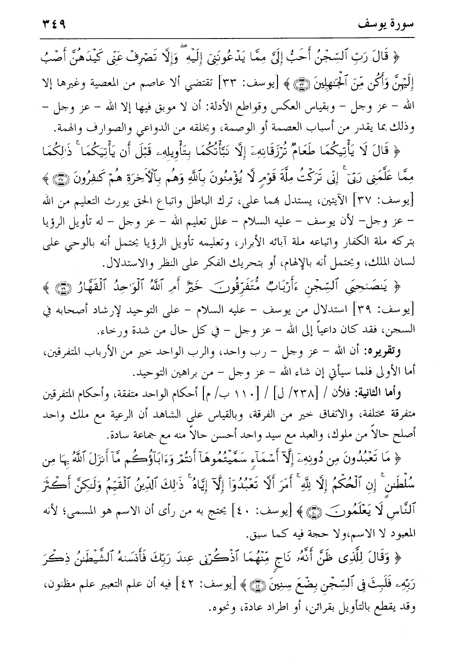 {ما تَعْبُدُونَ مِنْ دُونِهِ إِلاّ أَسْماءً سَمَّيْتُمُوها أَنْتُمْ وَآباؤُكُمْ ما أَنْزَلَ اللهُ بِها مِنْ سُلْطانٍ إِنِ الْحُكْمُ إِلاّ لِلّهِ أَمَرَ أَلاّ تَعْبُدُوا إِلاّ إِيّاهُ ذلِكَ الدِّينُ الْقَيِّمُ وَلكِنَّ أَكْثَرَ النّاسِ لا يَعْلَمُونَ} (40) [يوسف: 40] يحتج به من رأى أن الاسم هو المسمى؛ لأنه المعبود لا الاسم، ولا حجة فيه كما سبق.