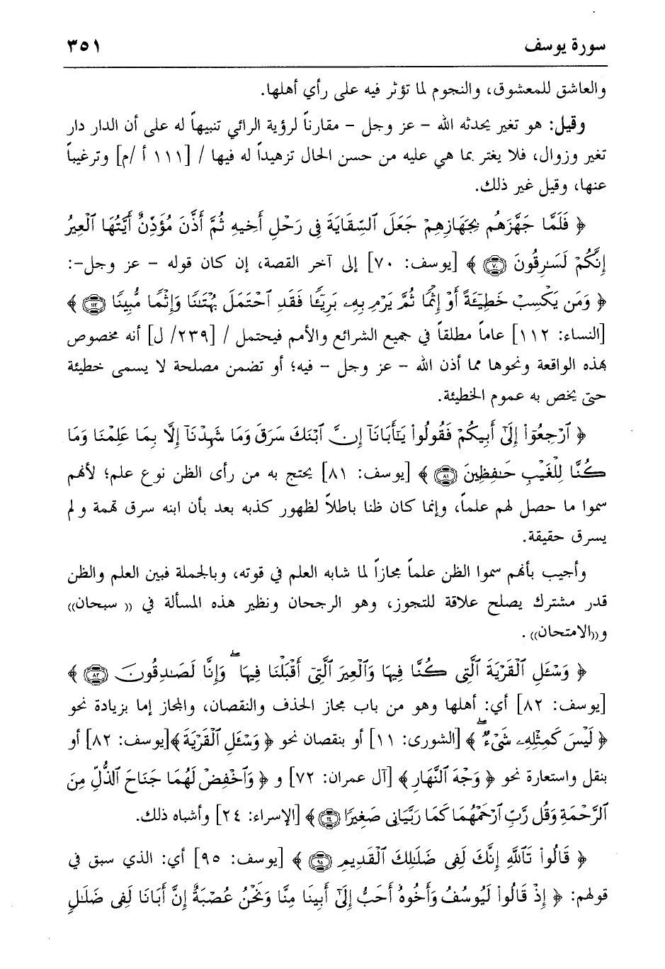 {وَسْئَلِ الْقَرْيَةَ الَّتِي كُنّا فِيها وَالْعِيرَ الَّتِي أَقْبَلْنا فِيها وَإِنّا لَصادِقُونَ} (82) [يوسف: 82] أي: أهلها وهو من باب مجاز الحذف والنقصان، والمجاز إما بزيادة نحو {لَيْسَ كَمِثْلِهِ شَيْءٌ} [الشورى: 11] أو بنقصان نحو {وَسْئَلِ الْقَرْيَةَ} [يوسف: 82] أو بنقل واستعارة نحو {وَجْهَ النَّهارِ} [آل عمران: 72] و {وَاِخْفِضْ لَهُما جَناحَ الذُّلِّ مِنَ الرَّحْمَةِ وَقُلْ رَبِّ اِرْحَمْهُما كَما رَبَّيانِي صَغِيراً} (24) [الإسراء: 24] وأشباه ذلك.