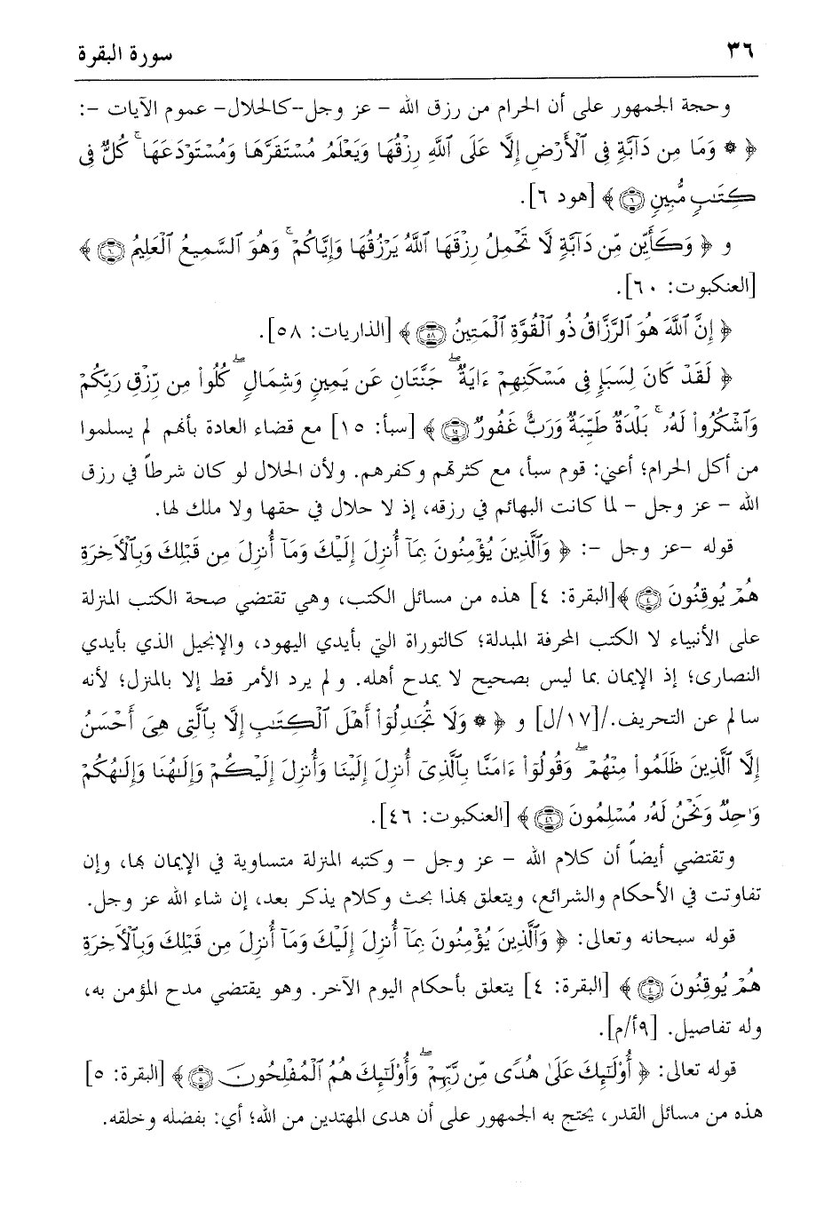 قوله-عز وجل-: {وَالَّذِينَ يُؤْمِنُونَ بِما أُنْزِلَ إِلَيْكَ وَما أُنْزِلَ مِنْ قَبْلِكَ وَبِالْآخِرَةِ هُمْ يُوقِنُونَ} (4) [البقرة: 4] هذه من مسائل الكتب، وهي تقتضي صحة الكتب المنزلة على الأنبياء لا الكتب المحرفة المبدلة؛ كالتوراة التي بأيدي اليهود، والإنجيل الذي بأيدي النصارى؛ إذ الإيمان بما ليس بصحيح لا يمدح أهله. ولم يرد الأمر قط إلا بالمنزل؛ لأنه سالم عن التحريف. / [17/ل] و {*وَلا تُجادِلُوا أَهْلَ الْكِتابِ إِلاّ بِالَّتِي هِيَ أَحْسَنُ إِلاَّ الَّذِينَ ظَلَمُوا مِنْهُمْ وَقُولُوا آمَنّا بِالَّذِي أُنْزِلَ إِلَيْنا وَأُنْزِلَ إِلَيْكُمْ وَإِلهُنا وَإِلهُكُمْ واحِدٌ وَنَحْنُ لَهُ مُسْلِمُونَ} (46) [العنكبوت: 46].