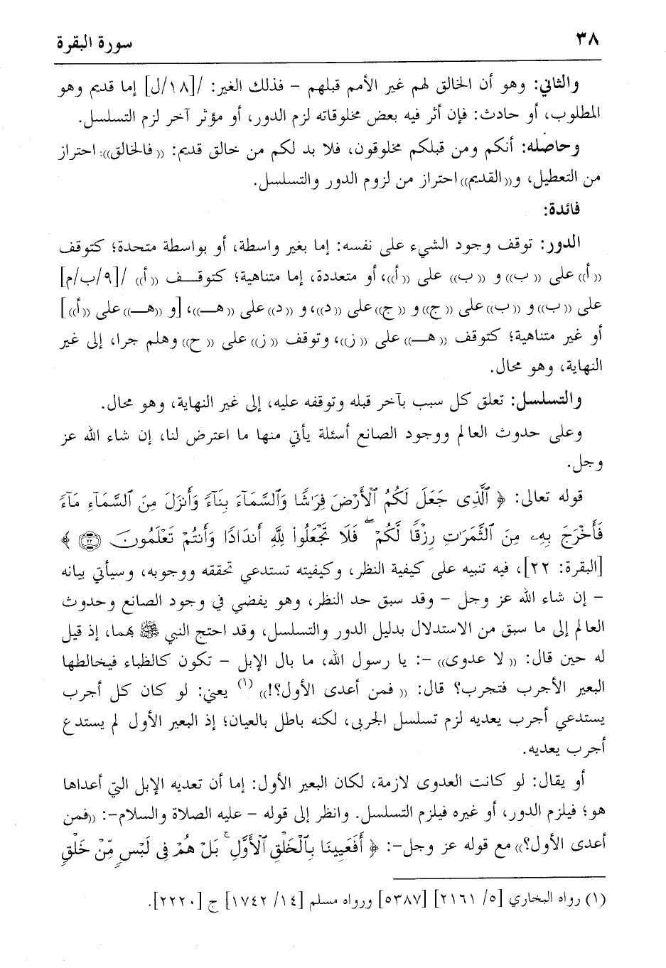قوله تعالى: {الَّذِي جَعَلَ لَكُمُ الْأَرْضَ فِراشاً وَالسَّماءَ بِناءً وَأَنْزَلَ مِنَ السَّماءِ ماءً فَأَخْرَجَ بِهِ مِنَ الثَّمَراتِ رِزْقاً لَكُمْ فَلا تَجْعَلُوا لِلّهِ أَنْداداً وَأَنْتُمْ تَعْلَمُونَ} (22) [البقرة: 22]، فيه تنبيه على كيفية النظر، وكيفيته تستدعي تحققه ووجوبه، وسيأتي بيانه -إن شاء الله عز وجل-وقد سبق حد النظر، وهو يفضي في وجود الصانع وحدوث العالم إلى ما سبق من الاستدلال بدليل الدور والتسلسل، وقد احتج النبي صلّى الله عليه وسلّم بهما، إذ قيل له حين قال: «لا عدوى» -: يا رسول الله، ما بال الإبل-تكون كالظباء فيخالطها البعير الأجرب فتجرب؟ قال: «فمن أعدى الأول؟ ! » (1) يعني: لو كان كل أجرب يستدعي أجرب يعديه لزم تسلسل الجربى، لكنه باطل بالعيان؛ إذ البعير الأول لم يستدع أجرب يعديه.