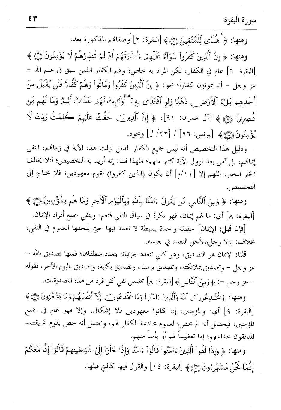 قلنا: الإيمان هو التصديق، وهو كلي تتعدد جزئياته بتعدد متعلقاتها؛ فمنها تصديق بالله- عز وجل-وتصديق بملائكته، وتصديق برسله، وتصديق بكتبه، وتصديق باليوم الآخر، فقوله -عز وجل-: {وَمِنَ النّاسِ} [البقرة: 8] تضمن نفي كل فرد من هذه التصديقات.
