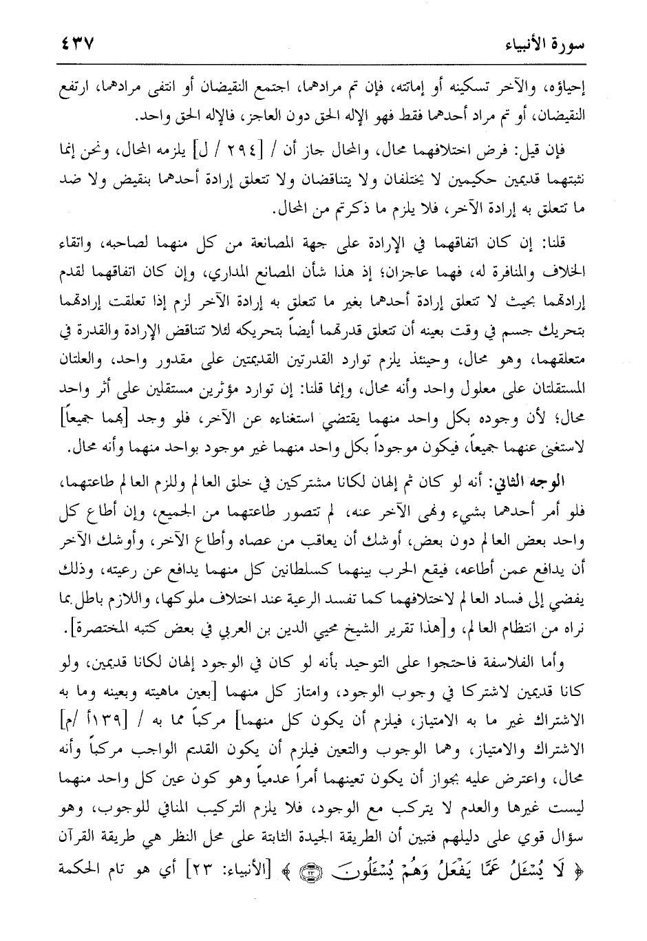 الوجه الثاني: أنه لو كان ثم إلهان لكانا مشتركين في خلق العالم وللزم العالم طاعتهما، فلو أمر أحدهما بشيء ونهى الآخر عنه، لم تتصور طاعتهما من الجميع، وإن أطاع كل واحد بعض العالم دون بعض، أوشك أن يعاقب من عصاه وأطاع الآخر، وأوشك الآخر أن يدافع عمن أطاعه، فيقع الحرب بينهما كسلطانين كل منهما يدافع عن رعيته، وذلك يفضي إلى فساد العالم لاختلافهما كما تفسد الرعية عند اختلاف ملوكها، واللازم باطل بما نراه من انتظام العالم، و [هذا تقرير الشيخ محيي الدين بن العربي في بعض كتبه المختصرة].
