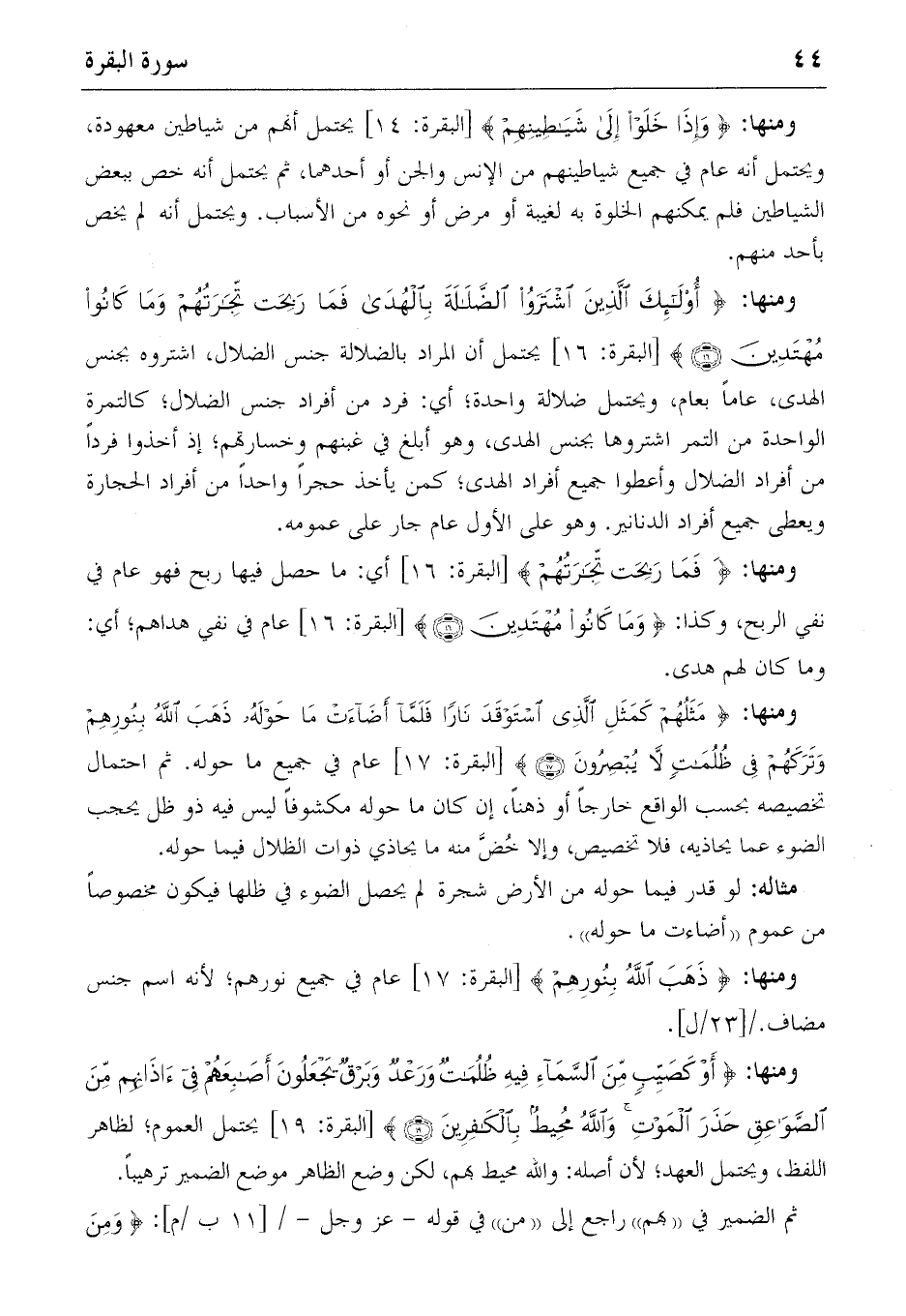 ومنها: {مَثَلُهُمْ كَمَثَلِ الَّذِي اِسْتَوْقَدَ ناراً فَلَمّا أَضاءَتْ ما حَوْلَهُ ذَهَبَ اللهُ بِنُورِهِمْ وَتَرَكَهُمْ فِي ظُلُماتٍ لا يُبْصِرُونَ} (17) [البقرة: 17] عام في جميع ما حوله. ثم احتمال تخصيصه بحسب الواقع خارجا أو ذهنا، إن كان ما حوله مكشوفا ليس فيه ذو ظل يحجب الضوء عما يحاذيه، فلا تخصيص، وإلا خضّ منه ما يحاذي ذوات الظلال فيما حوله.