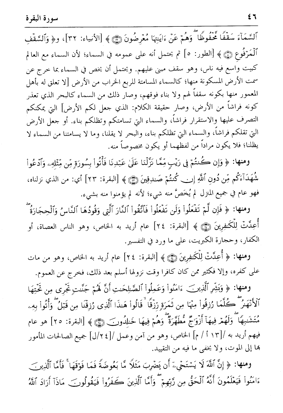 ومنها: {فَإِنْ لَمْ تَفْعَلُوا وَلَنْ تَفْعَلُوا فَاتَّقُوا النّارَ الَّتِي وَقُودُهَا النّاسُ وَالْحِجارَةُ أُعِدَّتْ لِلْكافِرِينَ} (24) [البقرة: 24] عام أريد به الخاص، وهو الناس العصاة، أو الكفار، وحجارة الكبريت، على ما ورد في التفسير.