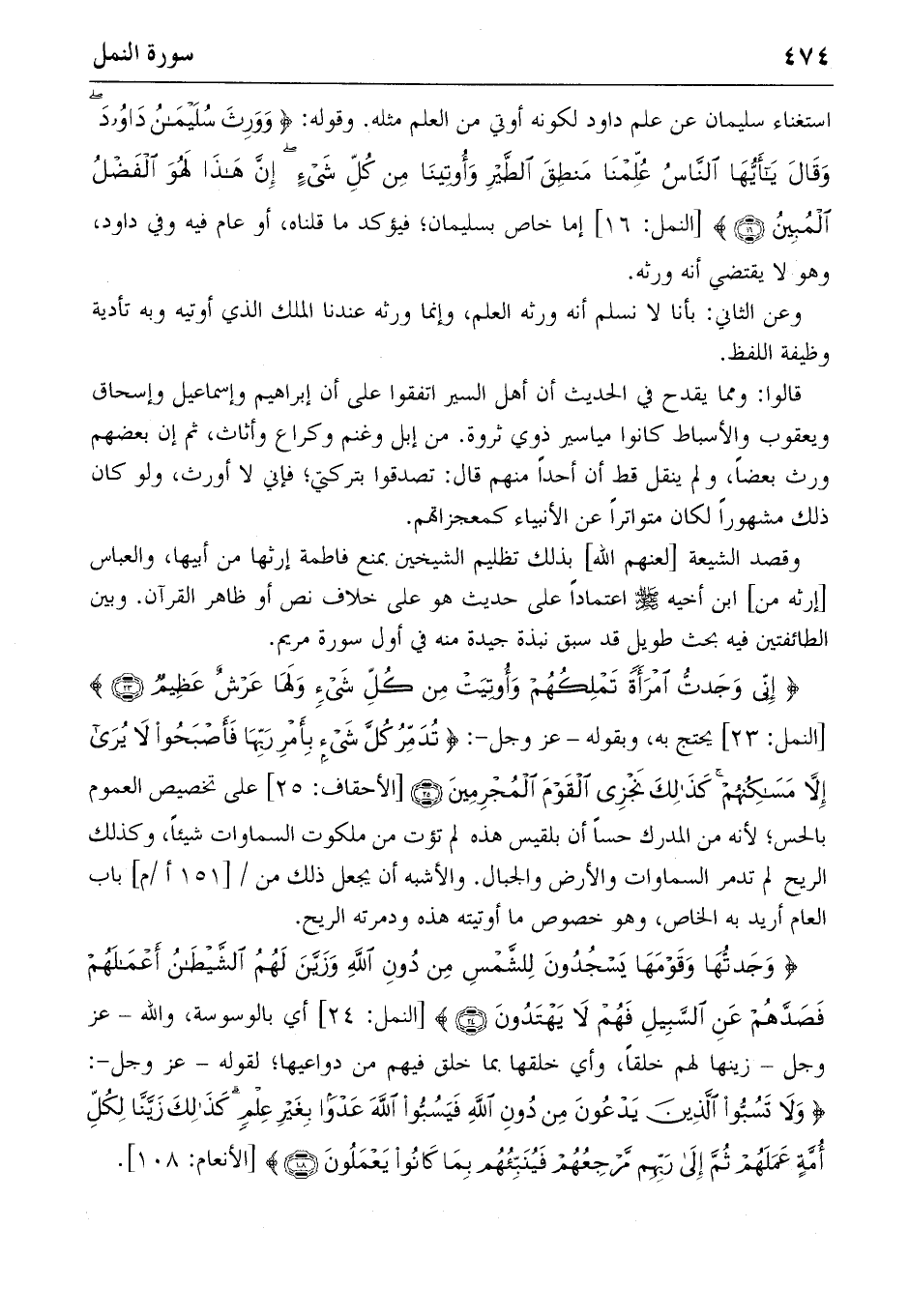 {إِنِّي وَجَدْتُ اِمْرَأَةً تَمْلِكُهُمْ وَأُوتِيَتْ مِنْ كُلِّ شَيْءٍ وَلَها عَرْشٌ عَظِيمٌ} (23) [النمل: 23] يحتج به، وبقوله-عز وجل-: {تُدَمِّرُ كُلَّ شَيْءٍ بِأَمْرِ رَبِّها فَأَصْبَحُوا لا يُرى إِلاّ مَساكِنُهُمْ كَذلِكَ نَجْزِي الْقَوْمَ الْمُجْرِمِينَ} (25) [الأحقاف: 25] على تخصيص العموم بالحس؛ لأنه من المدرك حسا أن بلقيس هذه لم تؤت من ملكوت السماوات شيئا، وكذلك الريح لم تدمر السماوات والأرض والجبال. والأشبه أن يجعل ذلك من/ [151 أ/م] باب العام أريد به الخاص، وهو خصوص ما أوتيته هذه ودمرته الريح.