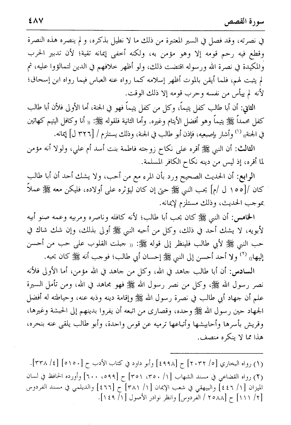 الخامس: أن النبي صلّى الله عليه وسلّم كان يحب أبا طالب؛ لأنه كافله وناصره ومربيه وعمه صنو أبيه لأبويه، لا يشك أحد في ذلك، وكل من أحبه النبي صلّى الله عليه وسلّم أولى بذلك، وإن شك شاك في حب النبي صلّى الله عليه وسلّم لأبي طالب فلينظر إلى قوله صلّى الله عليه وسلّم: «جبلت القلوب على حب من أحسن إليها» (2) ولا أحد أحسن إلى النبي صلّى الله عليه وسلّم إحسان أبي طالب؛ فوجب أنه صلّى الله عليه وسلّم كان يحبه.