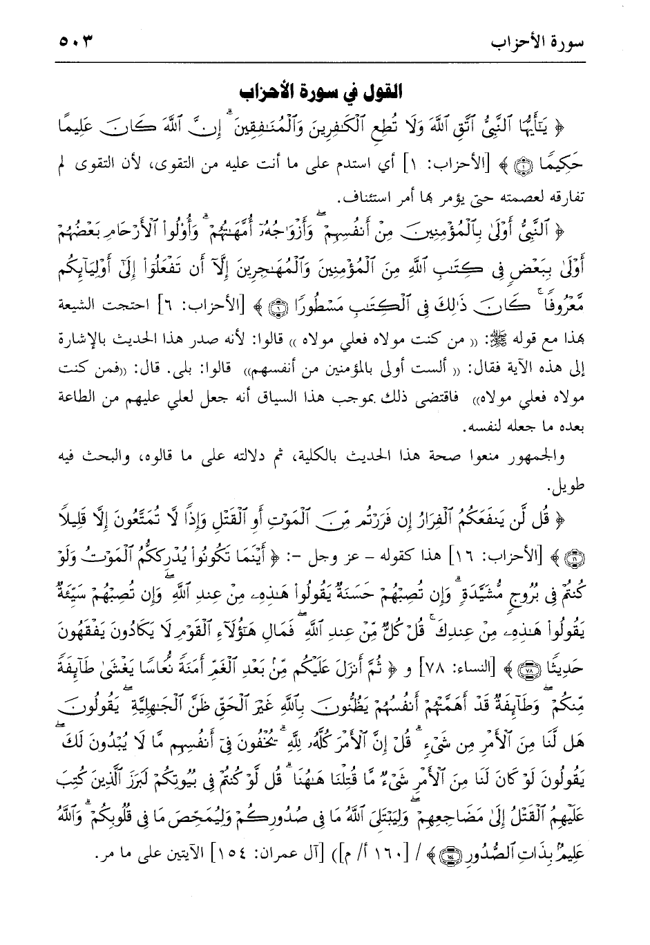 {النَّبِيُّ أَوْلى بِالْمُؤْمِنِينَ مِنْ أَنْفُسِهِمْ وَأَزْواجُهُ أُمَّهاتُهُمْ وَأُولُوا الْأَرْحامِ بَعْضُهُمْ أَوْلى بِبَعْضٍ فِي كِتابِ اللهِ مِنَ الْمُؤْمِنِينَ وَالْمُهاجِرِينَ إِلاّ أَنْ تَفْعَلُوا إِلى أَوْلِيائِكُمْ مَعْرُوفاً كانَ ذلِكَ فِي الْكِتابِ مَسْطُوراً} (6) [الأحزاب: 6] احتجت الشيعة بهذا مع قوله صلّى الله عليه وسلّم: «من كنت مولاه فعلي مولاه» قالوا: لأنه صدر هذا الحديث بالإشارة إلى هذه الآية فقال: «ألست أولى بالمؤمنين من أنفسهم» قالوا: بلى. قال: «فمن كنت مولاه فعلي مولاه» فاقتضى ذلك بموجب هذا السياق أنه جعل لعلي عليهم من الطاعة بعده ما جعله لنفسه.