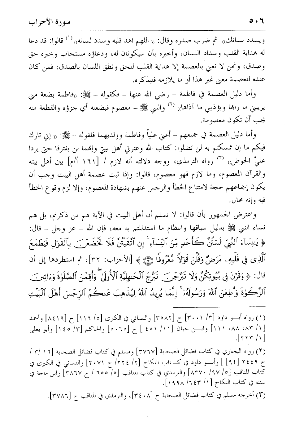 {يا نِساءَ النَّبِيِّ لَسْتُنَّ كَأَحَدٍ مِنَ النِّساءِ إِنِ اِتَّقَيْتُنَّ فَلا تَخْضَعْنَ بِالْقَوْلِ فَيَطْمَعَ الَّذِي فِي قَلْبِهِ مَرَضٌ وَقُلْنَ قَوْلاً مَعْرُوفاً} (32) [الأحزاب: 32]، ثم استطردها إلى أن قال: {وَقَرْنَ فِي بُيُوتِكُنَّ وَلا تَبَرَّجْنَ تَبَرُّجَ الْجاهِلِيَّةِ الْأُولى وَأَقِمْنَ الصَّلاةَ وَآتِينَ الزَّكاةَ وَأَطِعْنَ اللهَ وَرَسُولَهُ إِنَّما يُرِيدُ اللهُ لِيُذْهِبَ عَنْكُمُ الرِّجْسَ أَهْلَ الْبَيْتِ}