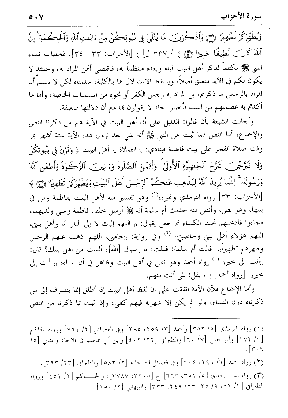 وأجابت الشيعة بأن قالوا: الدليل على أن أهل البيت في الآية هم من ذكرنا النص والإجماع، أما النص فما ثبت عن النبي صلّى الله عليه وسلّم أنه بقي بعد نزول هذه الآية ستة أشهر يمر وقت صلاة الفجر على بيت فاطمة فينادي: «الصلاة يا أهل البيت {وَقَرْنَ فِي بُيُوتِكُنَّ وَلا تَبَرَّجْنَ تَبَرُّجَ الْجاهِلِيَّةِ الْأُولى وَأَقِمْنَ الصَّلاةَ وَآتِينَ الزَّكاةَ وَأَطِعْنَ اللهَ وَرَسُولَهُ إِنَّما يُرِيدُ اللهُ لِيُذْهِبَ عَنْكُمُ الرِّجْسَ أَهْلَ الْبَيْتِ وَيُطَهِّرَكُمْ تَطْهِيراً} (33) [الأحزاب: 33] رواه الترمذي وغيره، (1) وهو تفسير منه لأهل البيت بفاطمة ومن في بيتها، وهو نص، وأنص منه حديث أم سلمة أنه صلّى الله عليه وسلّم أرسل خلف فاطمة وعلي ولديهما، فجاءوا فأدخلهم تحت الكساء ثم جعل يقول: «اللهم إليك لا إلى النار أنا وأهل بيتي، اللهم هؤلاء أهل بيتي وخاصتي» (2) وفي رواية: «حامتي، اللهم أذهب عنهم الرجس وطهرهم تطهيرا» قالت أم سلمة: فقلت: يا رسول [الله]، ألست من أهل بيتك؟ قال: