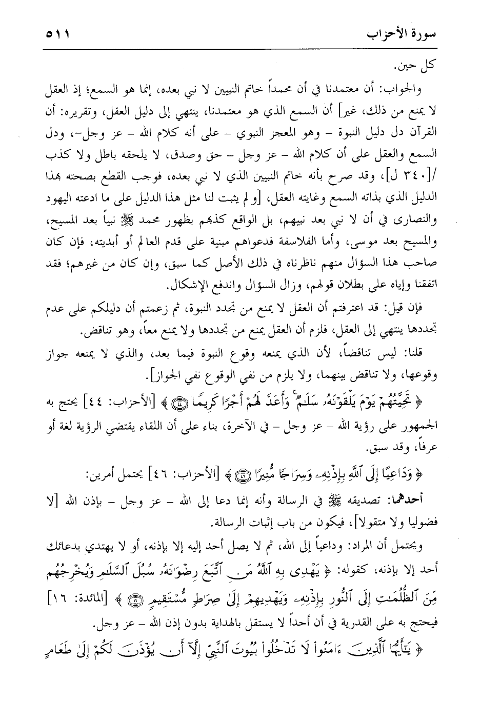 {تَحِيَّتُهُمْ يَوْمَ يَلْقَوْنَهُ سَلامٌ وَأَعَدَّ لَهُمْ أَجْراً كَرِيماً} (44) [الأحزاب: 44] يحتج به الجمهور على رؤية الله-عز وجل-في الآخرة، بناء على أن اللقاء يقتضي الرؤية لغة أو عرفا، وقد سبق.