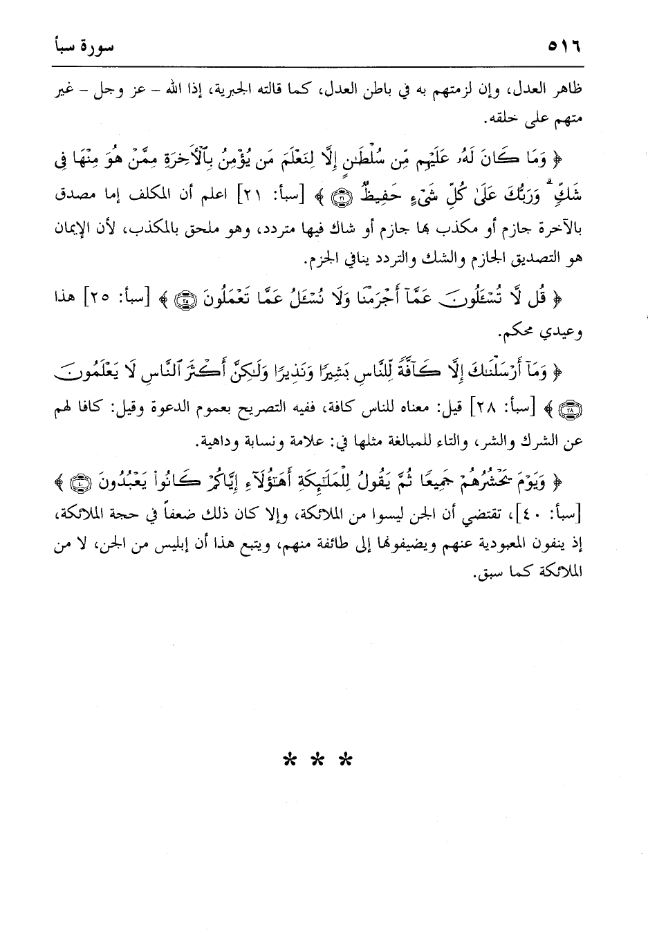 {وَما أَرْسَلْناكَ إِلاّ كَافَّةً لِلنّاسِ بَشِيراً وَنَذِيراً وَلكِنَّ أَكْثَرَ النّاسِ لا يَعْلَمُونَ} (28) [سبأ: 28] قيل: معناه للناس كافة، ففيه التصريح بعموم الدعوة وقيل: كافا لهم عن الشرك والشر، والتاء للمبالغة مثلها في: علامة ونسابة وداهية.